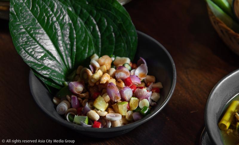 ต่อกันด้วยอาหารจานหลักที่ทยอยมาเสิร์ฟไม่ขาดสาย อาทิ หมกหม้อไก่ไข่อ่อน (250 บาท) ที่หน้าตาอาจดูโลคัล แต่รับรองว่ารสชาติต้องถูกใจทั้งชาวกรุงเทพฯ และชาวต่างชาติแน่ ๆ ที่สำคัญคือเขาไม่ได้ใส่ปลาร้าลงไปต้มด้วยนะ ใครที่ทานปลาร้าไม่เป็นก็ไม่ต้องกลัวไปล่ะ รวมถึง เมี่ยงปลาทับทิม (200 บาท) ที่รสชาติถึงเครื่องถึงใจจนถ้าไปคราวหน้าก็คงต้องสั่งเมนูนี้อีกรอบ