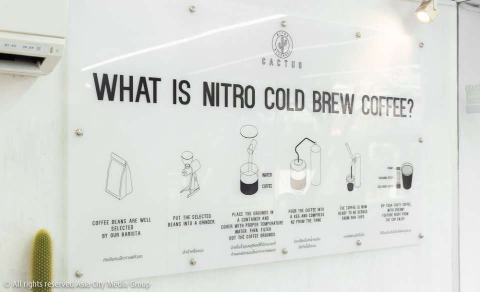 เบสหลักทั้งเมล็ดกาแฟจากเชียงราย และเมล็ดพิเศษในบางช่วงจากเคนย่า รวมไปถึงใบชาอบกลิ่นกุหลาบจากเชียงรายจะถูกนำมาสกัดเย็น (Cold Brew Process) แล้วใส่ลงในถังอัดก๊าซไนโตรเจน และกดออกมาจากหัวแท็ปทั้ง 6 กลายเป็นเบสของเครื่องดื่มที่หลากหลายของร้าน อาทิ Nitro Cold Brew Coffee (90 บาท) ที่การอัดก๊าซไนโตรเจนเข้าไป จะช่วยทำให้กาแฟสกัดเย็นบ้าน ๆ มีความนุ่มละมุน เทกซ์เจอร์มีความมันมากขึ้น และดึงกลิ่นกาแฟออกมาได้ชัดขึ้นด้วยเช่นกัน