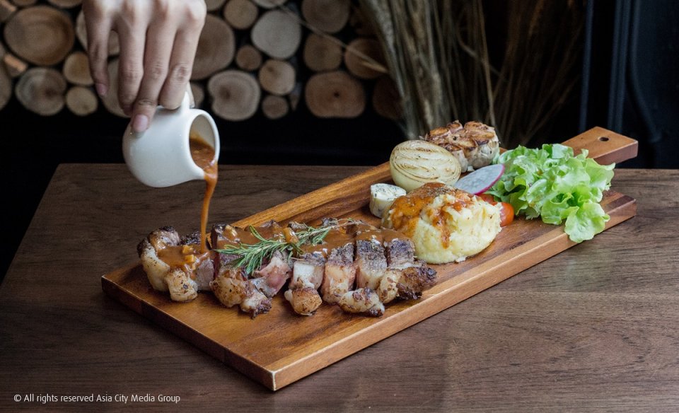 อาหารแต่ละจานเน้นวัตถุดิบชั้นดี อาทิ ร็อกเก็ตสลัดกับฟัวกราส์ (360 บาท) หรือสเต็กเนื้อนำเข้าจากออสเตรเลีย ทั้งเนื้อสันนอก (800 กรัม 920 บาท) สันในและซอสเห็ด (650 บาท) และยังมีพาสต้าและสปาเก็ตตี้ให้เลือกอีกเพียบ
