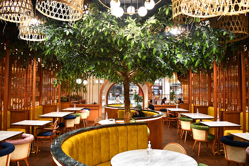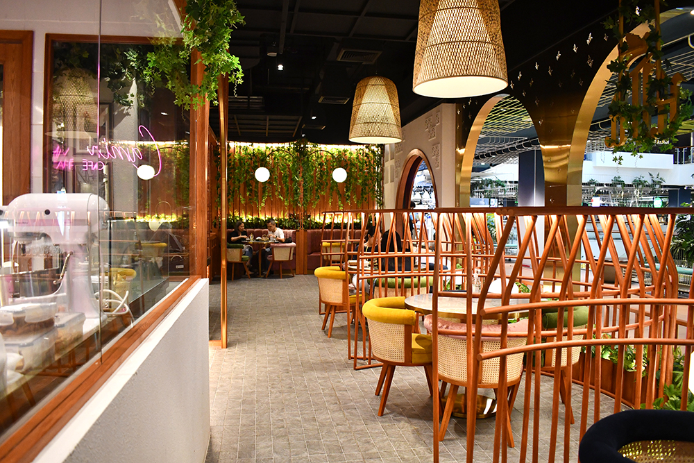 เราชอบการตกแต่งร้านสาขานี้ที่แปลกตาโดดเด้งออกมาจากร้านอื่น ๆ ในบริเวณชั้น 6 ของเซ็นทรัลเวิลด์ ซึ่งทำให้การเดินหาร้าน Camin Cuisine & Cafe นั้นง่ายกว่าหาร้านอื่น ๆ หลายเท่าตัว (ถ้าใครมาเดินชั้น 6 แล้วไม่เห็นร้านนี้ เราแนะนำให้ไปตรวจสายตาก่อน!) และถ้าใครเป็นแฟนคลับร้านนี้อยู่แล้ว จะรู้ว่าทุกสาขาเขาจะตกแต่งไม่เหมือนกันเลย ครั้งนี้ทางร้านเลือกใช้ธีมการตกแต่งด้วยวัสดุท้องถิ่นภาคใต้ กระจกด้านหน้าร้านถูกแทนที่ด้วยโครงสร้างโปร่งตาที่ได้แรงบันดาลใจมาจากสุ่มไก่ พร้อมคุมโทนด้วยสีน้ำตาล-ทอง และตกแต่งด้วยต้นไม้สีเขียว เพื่อเพิ่มความชุ่มชื่นตาให้พื้นที่ตามแบบฉบับของร้านขมิ้นในทุกสาขาที่ต้องมีต้นไม้เสมอ
