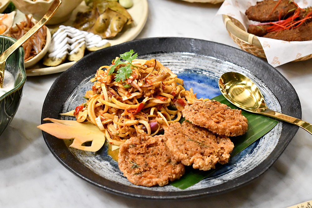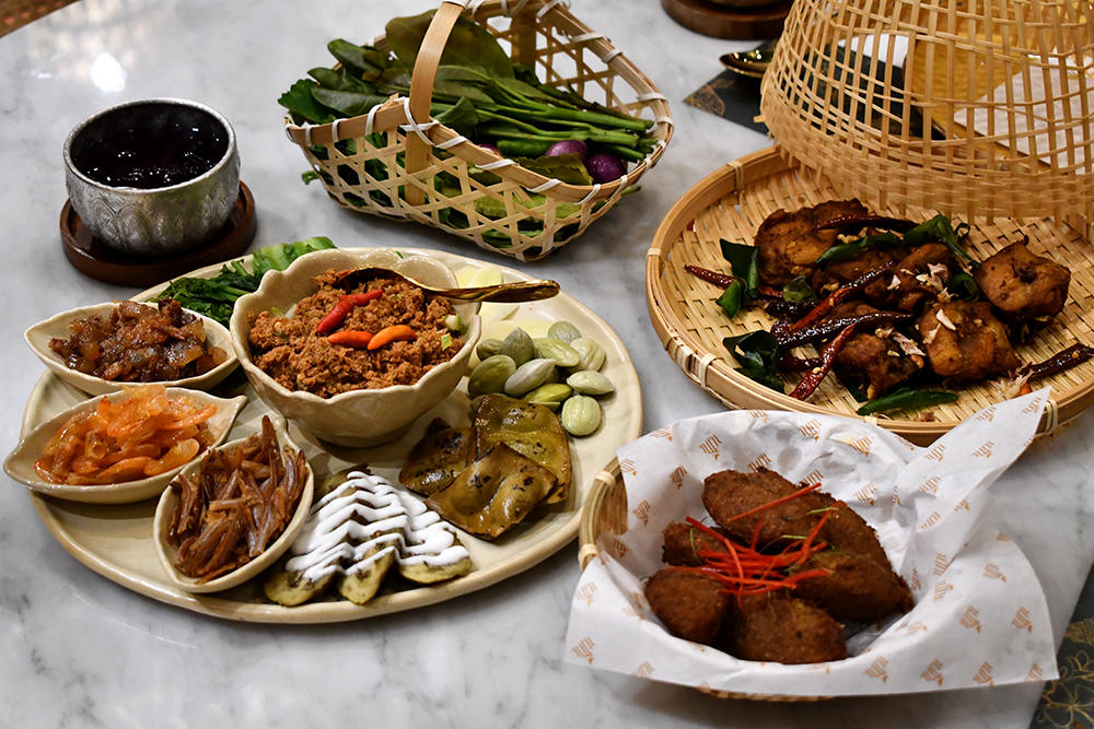 อีกอย่างที่ทำให้เราชอบร้านนี้มาก ๆ คือการต้อนรับขับสู้ที่ทำให้รู้สึกเหมือนมากินข้าวบ้านเพื่อนจริง ๆ ด้วยการเสิร์ฟเวลคัมดริงก์เป็นน้ำสมุนไพรไทยเย็นชื่นใจ ที่จะเปลี่ยนไปในแต่ละวัน พร้อมตะกร้าผักเหนาะ ที่เป็นผักสดประจำภาคใต้มาให้ตั้งแต่ยังไม่ทันได้สั่งอาหาร ส่วนเมนูไฮไลต์ที่มาแล้วไม่ควรพลาดได้แก่ แกงส้มปลากะพงยอดมะพร้าว (250 บาท) เมนูฮิตที่คนภาคกลางเรียกแกงเหลือง ทีเด็ดอยู่ที่ความเข้มข้นของเครื่องแกงที่จัดจ้านเหมือนคุณแม่ตำเอง ซึ่งเป็นสูตรผสมผสานระหว่างแกงส้มแบบกระบี่ กับแกงส้มแบบนครศรีธรรมราช ความเจ๋งคือเราสามารถเลือกผักและเนื้อสัตว์ที่ใส่ในแกงส้มได้ด้วย จะเปลี่ยนปลากะพงเป็นกุ้ง ปลากระบอก หมูสามชั้น หรือเปลี่ยนยอดมะพร้าวเป็นหน่อไม้ดองหรือสับปะรดก็ได้ตามใจชอบ