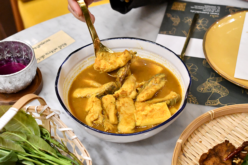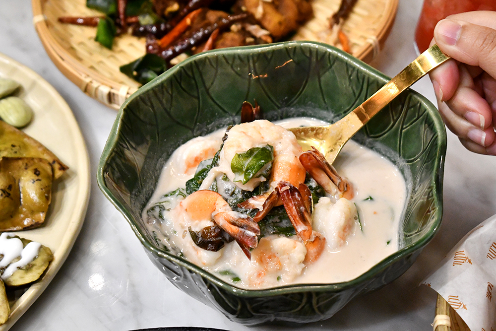 ส่วนอีก 2 จาน สำหรับคนรักของทอดที่เราไม่อยากให้พลาดคือ ไก่ทอดขมิ้น (150 บาท) เมนูขายดีตลอดการที่ชูความเป็นร้าน 'ขมิ้น' ได้เป็นอย่างดี และ ลูกเห็ด (150 บาท) มันสำปะหลังที่คลุกเคล้าด้วยเนื้อปลาและเครื่องแกงที่เอาไว้ตัดความเผ็ดร้อนจากแกงส้มได้เวิร์กมาก ๆ และอีกเมนูต้มที่ทุกคนต้องรักแรง ได้แก่ ใบเหลียงต้มกะทิกุ้งสด (270 บาท) ที่เสิร์ฟกุ้งตัวโต ๆ เนื้อแน่น ๆ มาในแกงกะทิเทกซเจอร์ข้นคลั่กพร้อมใบเหลียงเพิ่มความมันนัว