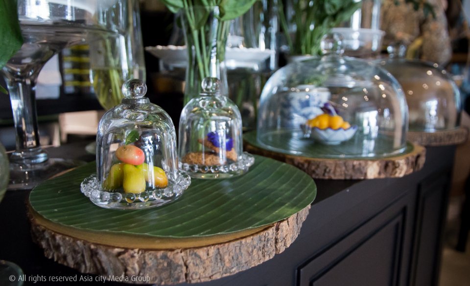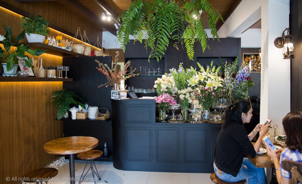 เคาน์เตอร์ที่มีต้นไม้ตกแต่งอย่างสวยงามและมีขนมไทยที่ทำสดใหม่ทุกวันวางเรียงรายอยู่ ซึ่งก็จะสลับสับเปลี่ยนหมุนเวียนไปเกือบทุกวันหรือทุกสัปดาห์ มีทั้งข้าวต้มมัด ขนมใส่ใส้ ขนมชั้น ทองหยิบ ทองหยอด ทองเอก ลูกชุบ ตะโก้ ขนมโสมนัส (คุกกี้โบราณ) และอย่างอื่นอีกเยอะแยะ เรียกได้ว่ามีเกือบทุกอย่างที่เรานึกถึงเลยล่ะ