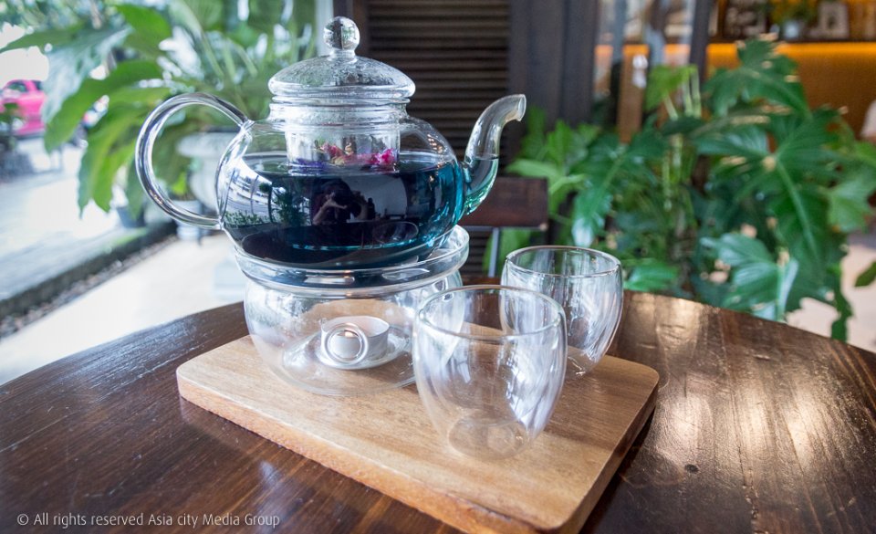 หรือถ้าใครอยากกลืนคล่องคอแบบไม่เลี่ยนเราว่าชาร้อนก็เวิร์กอย่าง ชากุหลาบอัญชัญ (250 บาท) เสิร์ฟมาในกาแก้วที่มีเทียนให้ความร้อนตลอด กลิ่นชาก็จะหอมกลิ่นดอกไม้ กินขนมต่อได้สบาย