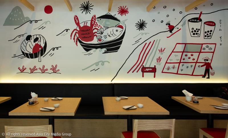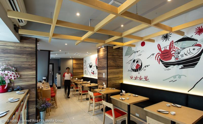 เมื่อเข้ามาภายในจะเห็นวอลเปเปอร์รูปวาดบอกเรื่องราวประวัติที่มาของร้านเป็นลายเส้นน่ารัก ๆ ประกอบตกแต่งร้าน ด้านสีของเฟอร์นิเจอร์ก็มีความจัดจ้านในเฉดโทนร้อน เพิ่มบรรยากาศให้สนุกสนานผสมด้วยโทนสีเนื้อไม้สไตล์ญี่ปุ่น และเมื่อได้เข้ามานั่งที่โต๊ะเราก็จะได้พบกับเมนูเล่มโต ด้านในแฝงไปด้วยรายการอาหารสารพัดสารเพให้เลือกมากมาย (แบบเยอะมากเล่มหนา ๆ)
