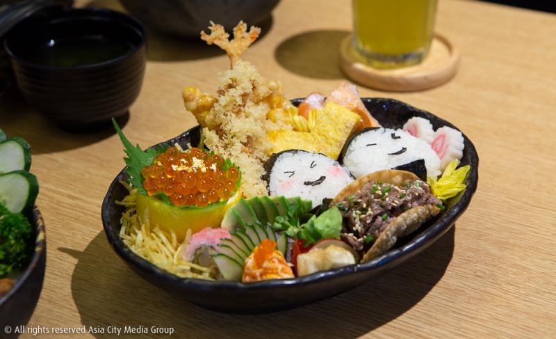 อีกหนึ่งเมนูที่รังสรรค์เรื่องราวตกแต่งหน้าตาดีไซน์โดยเชฟเบนซ์ ผู้มีประสบการณ์ทำเรียนรู้วิธีทำอาหารอยู่ในญี่ปุ่นมากว่า 5 ปีกับเมนูชื่อ Hokkaido Lovers (500 บาท) บนจานประดับตกแต่งไปด้วยข้าวปั้นสองก้อนที่มีกลิ่นบ๊วยกับซากุระ กัดไปหนึ่งคำความญี่ปุ่นก็ลอยมาเลย ส่วนหน้าตาบนข้าวปั้นนั้นก็คือลักษณะใบหน้าของเชฟนั่นเอง มีของทอดเป็นกุ้งเทมปุระ ซูชิแซลมอน ไข่หวาน ไข่ปลาแซลมอน และตบท้ายมาด้วยเนื้อชาบูคาโกชิม่าเกรดพรีเมียมจากญี่ปุ่น ทั้งหมดรวมเป็นเมนูหน้าตาน่ารักกับความอร่อยที่หลากหลาย