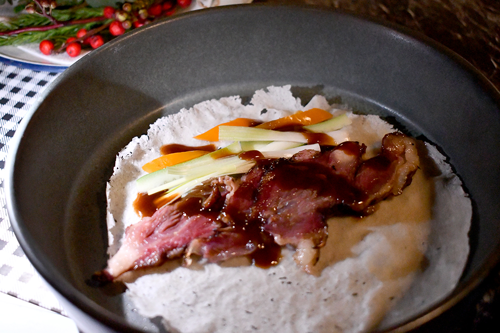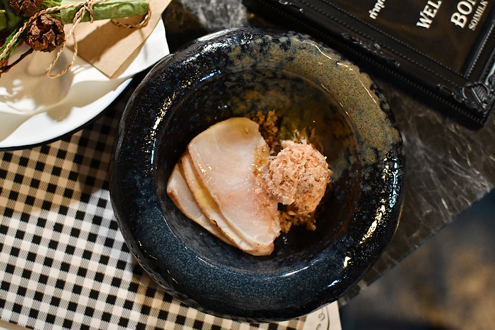 เริ่มมาด้วยสองคอร์สแรกอย่าง Smoked Fish & The Pit Ice Cream ปลาช่อนทะเลรมควันถึง 2 รอบด้วยฟางและกากมะพร้าว เสิร์ฟคู่ไอศกรีมรสซอสบาร์บีคิวที่มีปลาแห้งโรยอยู่ด้านบนจากฝั่ง Pit Master และ Peking Smoked Cheek แก้มวัวชิ้นใหญ่คัดพิเศษที่สโม้กด้วยเทคนิคพิเศษไม่ให้เนื้อหด นำมาห่อด้วยแป้งโรตีสายไหมคล้ายเป็ดปักกิ่ง ซึ่งทั้งสองจานนี้จับคู่ลงตัวกับค็อกเทลแก้วแรกจากพี่กานต์อย่าง Honey Jack ที่ใช้ความหอมหวานแบบฉบับเฉพาะตัวของ Jack Daniel's Honey Whiskey มาผสมเข้ากับกลิ่นพิเศษของผลไม้อย่างฝรั่ง และสมุนไพรอย่างดอกผักชี จนได้มาเป็นเครื่องดื่มที่จับคู่เข้ากับอะไรก็อร่อยไปซะหมด