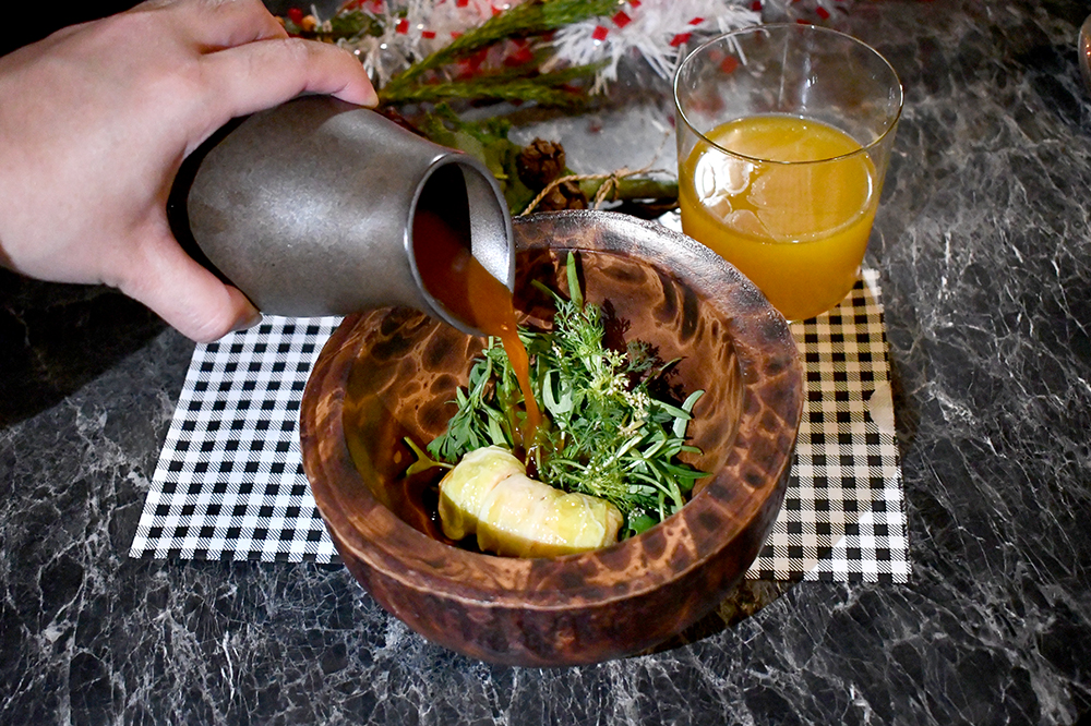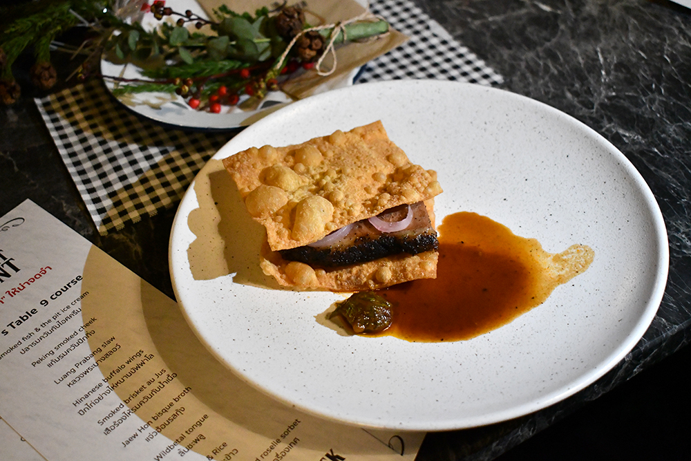 อีกสองคอร์สที่เราชอบมากเป็นพิเศษ ขอยกให้กับ Smoked Brisket au Jus เนื้อเสือร้องไห้ที่รมควันกับน้ำซอสเนื้อรสเบา ๆ ประกบด้วยแผ่นแป้งบางกรอบเหมือนกำลังกิน Sando หรือแซนวิชสไตล์ญี่ปุ่นที่ชุ่มซอสอยู่อย่างไรอย่างนั้น และ Jaew Hon Bisque Broth จานที่เราชอบที่สุดในคอร์สนี้ ทำออกมาเป็นซุปรสกุ้งคล้ายแจ่วฮ้อน พร้อมเนื้อที่ถูกห่อด้วยเทคนิคคล้ายการทำติ่มซำ จุด ๆ นี้คือกินคู่กับเครื่องดื่มแก้วพิเศษอย่าง No.7 ที่พี่กานต์เอาสปิริตชื่อดังของแบรนด์อย่าง Jack Daniel's No.7 ไปผสมกับวัตถุดิบอย่างพริกหยวก น้ำมันงา สับปะรด และส้ม จนได้เป็นเครื่องดื่มที่รสชาติแปลกหูแปลกลิ้นแบบที่เราหาดื่มที่อื่นไม่ได้แน่ ๆ