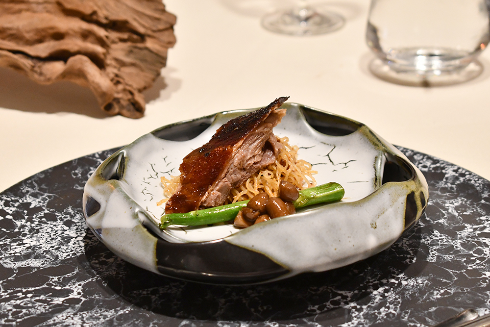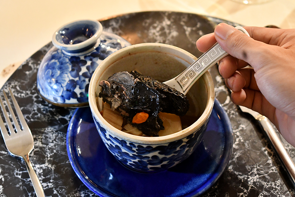 หมื่นปี หมื่นหมื่นปี คือชื่อซุปที่เสิร์ฟมาในคอร์สถัดไป ซึ่งเชฟเลือกใช้ไก่ดำมาตุ๋นกับหอยเชลล์อบแห้ง เก๋ากี้ และ ฮ่วยซัว ซึงถือเป็นสมุนไพรจีนหายาก และไปต่อกันที่เมนคอร์สอย่าง มัจฉาลุยไฟ โดยเชฟกิ๊กนำปลาเก๋าแดงมาราดด้วยน้ำมันที่ร้อนจัดจนสะดุ้งไฟ จับคู่กับซอสขิงสไตล์ฮ่องกงที่เราติดใจในรสชาติเอามาก ๆ
