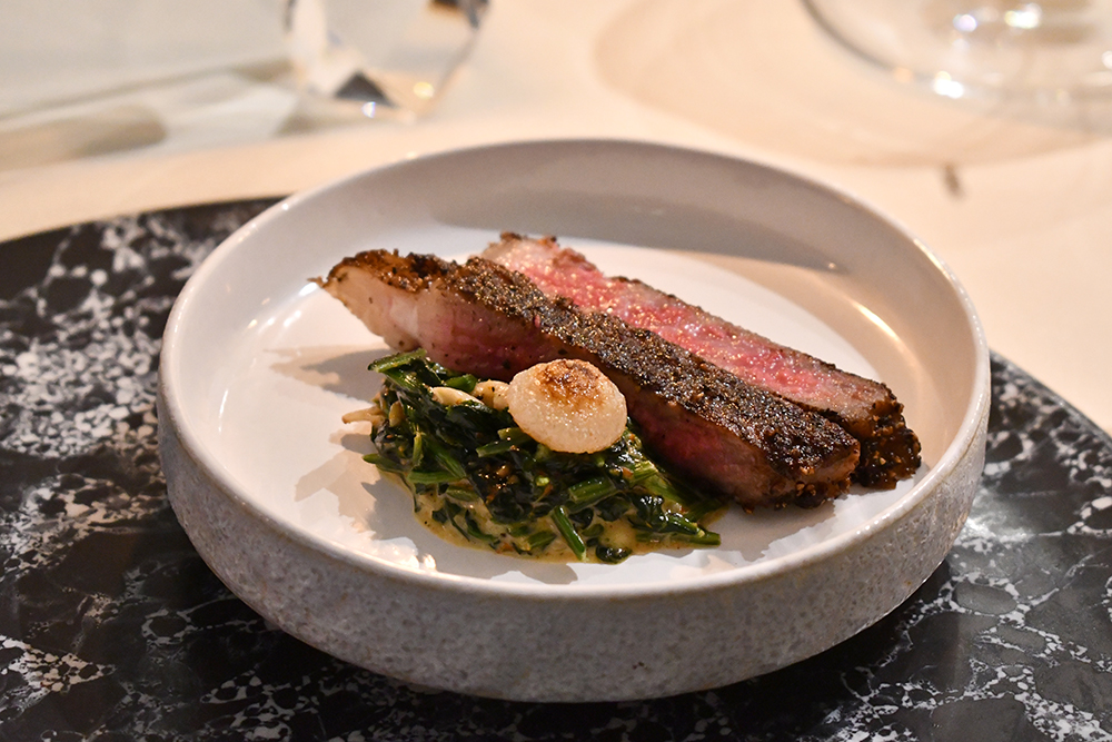 เมนคอร์สอีกจานที่เราอยากให้ทุกคนเก็บท้องไว้รออย่าง ราชสีห์คำราม ซึ่งเป็นการทวิสต์เมนูขึ้นชื่อของร้านเลิศทิพย์อย่างเมนูเนื้อน้ำมันหอย โดยเปลี่ยนจากเนื้อธรรมดามาใช้เนื้อวากิวเกรด A5 สายพันธุ์อากิตะ ส่วนสตริปลอยน์ มาเคลือบด้วยพริกไทยดำก่อนนำไปย่างจนผิวด้านนอกสุกกรอบ เสิร์ฟคู่กับปวยเล้งผัดน้ำมันหอยและครีมที่เปิดมิติการทานเนื้อมันหอยแบบที่โลกต้องจำ