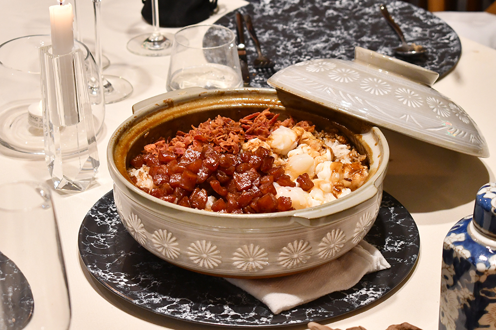 ปิดท้ายด้วยของคาวจานสุดท้ายอย่าง คิดถึงจิมซาจุ่ย ข้าวอบหม้อดินที่ทำมาเสิร์ฟเพราะคิดถึงย่านดังในฮ่องกง ซึ่งถ้าใครเคยลองชิมเมนูนี้ที่ฮ่องกงจะรู้ว่าทำยากมาก ๆ เพราะมีเซอร์ไพรส์อยู่ที่ข้าวตรงก้นหม้อที่โดนไฟจนกรอบกรุบ แต่ถ้าใครทำไม่เป็นก็จะไหม้ไปเลย พร้อมใช้เนื้อภูเก็ตล็อบสเตอร์ที่เหลือจากเมนูแรกมาเป็นท็อปปิงคู่กับกุนเชียงและเบคอนกรอบ แก๊งไหนที่จองมาแล้วกินคอร์สนี้ไม่หมด เชฟกิ๊กก็ใจดีห่อข้าวอบใส่กล่องให้ทุกคนเอากลับบ้านไปอุ่นกินเป็นมื้อเช้าในวันต่อไปด้วยนะ