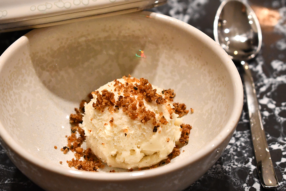ตัดเลี่ยนคอร์สสุดท้ายด้วยไอศกรีมวานิลลาที่เซอร์ไพรส์เราอีกแล้วด้วยครัมเบิลที่โรยมาด้านบน เพราะเป็นครัมเบิลรสซอส xo และพริกแห้ง มีความเค็มปะแล่ม และเผ็ดซ่าเบา ๆ ถือเป็นของหวานปิดท้ายสไตล์จีนโมเดิร์นที่ทำออกมาได้ดีมากจริง ๆ