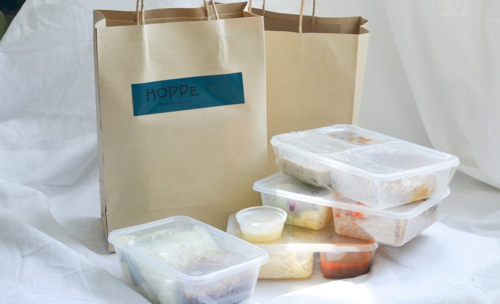 สำหรับโจทย์ที่เราตั้งให้ตัวเองวันนี้ก็คือ จะต้องเป็นร้านที่มีทั้งอาหารไทยและฝรั่งให้เลือกสั่งครบจบในที่เดียว เพื่อแก้ปัญหาการตบตีกับเพื่อนร่วมห้องที่บางมื้อก็ตกลงกันไม่ได้ว่าจะสั่งจากร้านไหน อย่างวันนี้ที่ฉันอยากกินอาหารไทยแซ่บ ๆ นัว ๆ คนร่วมห้องร่วมบ้านก็เกิดอยากจะกินสปาเกตตี้ขึ้นมาเสียอย่างนั้น และนั่นจึงเป็นที่มาของการเลือกเปิดกล่องเดลิเวอรี่จาก Hoppe Coffeehouse ร้านอาหารที่ชื่อเหมือนจะขายแค่กาแฟ แต่จริงจังที่สุดในเรื่องอาหาร เพราะเมนูของเขาครอบคลุมตั้งแต่อาหารไทยหาทานยากอย่าง แกงเผ็ดลิ้นจี่ไก่ ไปจนถึงอาหารฝรั่งจ๋าอย่าง สปาเกตตี้โบโลเนส