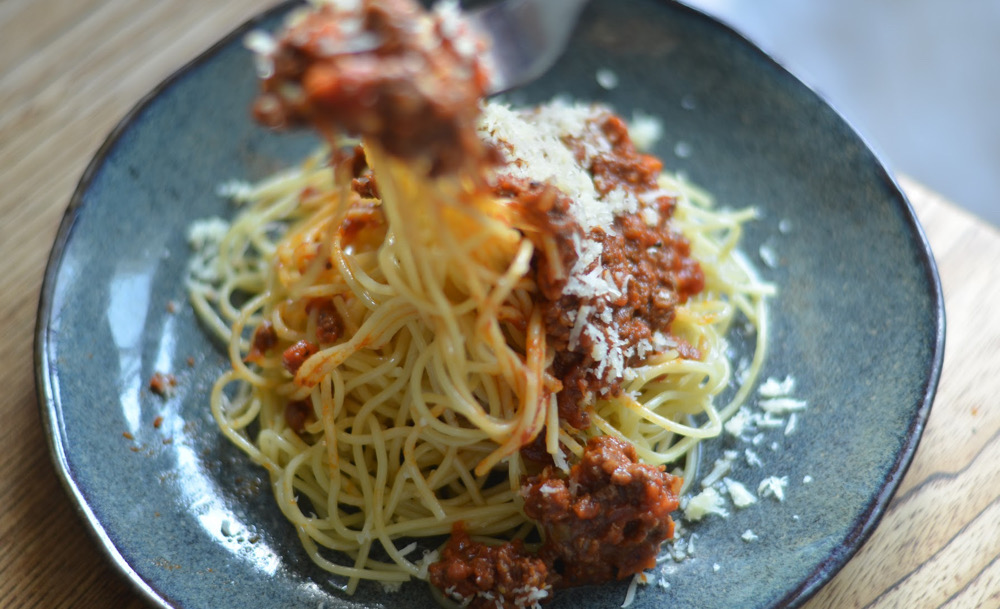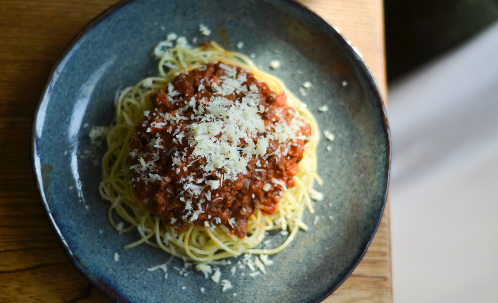 ขอเริ่มจากฝั่งอาหารฝรั่งก่อน เมนูแรกที่เราสั่งมาลองก็คือ สปาเกตตี้โบโลเนสเนื้อ (ราคาปกติ 249 บาท แต่ช่วงนี้ลดสูงสุด 50 เปอร์เซ็นต์ ทุกเมนู ถึงสิ้นเดือน เม.ย. ทุกเมนู เราจึงสั่งได้ในราคา 174 บาท) ชิมเข้าไปคำแรกก็ต้องยอมรับว่าซอสเนื้อของเขานั้นเข้มข้นและถึงเนื้อมากจริง ๆ แบบว่าถึงจะเคี่ยวจนเปื่อย แต่ก็ยังรับรสของเนื้อที่มากับกลิ่นหอมของเครื่องเทศได้เต็ม ๆ เสียดายว่าถ้าไปนั่งที่ร้านคงได้กินเส้นสปาเกตตี้ที่ลวกมาได้พอดีเด้งหนึบ แต่ด้วยความที่บ้านเราอยู่ค่อนข้างไกลจากร้าน กว่าพี่ไลน์แมนจะมาถึง เส้นของเราจึงเกินความสุกแบบเพอร์เฟกต์ไปแล้ว