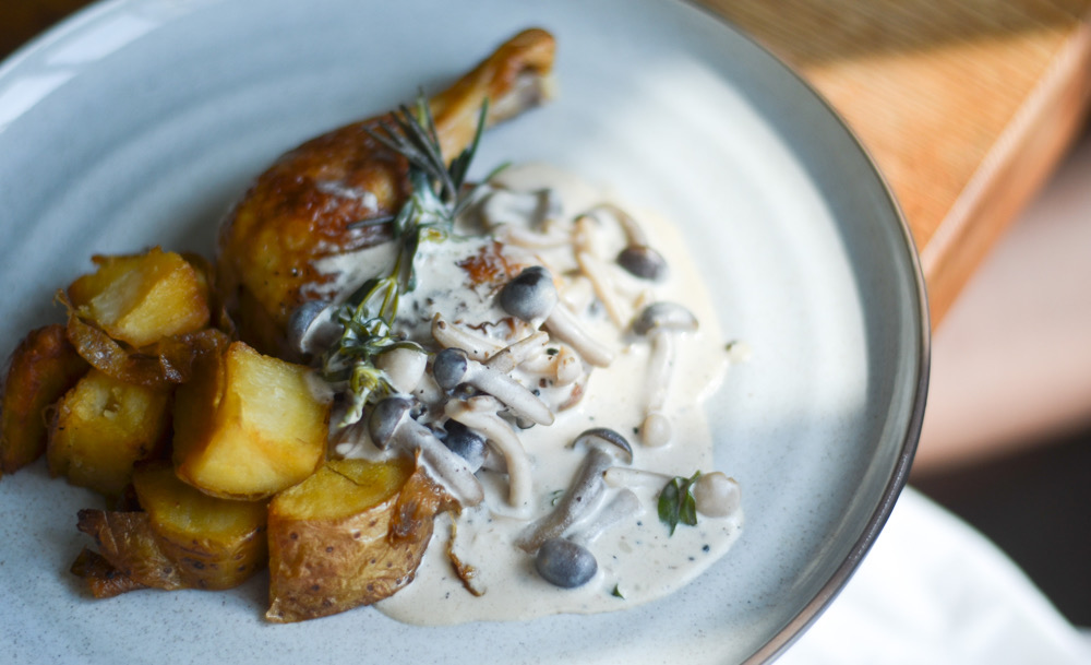 จานถัดมาเป็นเมนู ไก่อบ HOPPE มันอบ และซอสเห็ด (ราคาปกติ 350 บาท ราคาลดแล้ว 175 บาท) เรายกให้จานนี้แหละเป็นจานโปรดของเรา ด้วยความที่เขาเลือกใช้น่องไก่ติดสะโพกซึ่งเป็นส่วนที่ชุ่มฉ่ำที่สุดของไก่ พอกินคู่กับซอสครีมเห็ดรสชาติหอมมันเข้มข้นเลยเสริมกันดีมาก ๆ ยิ่งจิ้มมันอบหั่นชิ้นที่ใส่มาเป็นเครื่องเคียงเข้าปาก ก็ยิ่งเข้ากัน