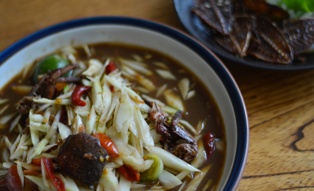 เมนูไทยสุดท้ายที่สั่งมาล้างปาก (หรือเปล่า) ก็คือ ส้มตำปูปลาร้าต้มสุกแกล้มก้างปลาข้างเหลืองทอด (60 บาท) ที่เราอยากลองของว่าเขาจะทำได้ถึงขนาดไหน พอชิมแล้วก็ต้องยอมรับว่า ของเขาเด็ดจริง โดยเฉพาะรสชาติความนัวและความหอมของน้ำปลาร้าที่ทำได้ 'ถึง' มาก ๆ ความดีความชอบอีกอย่างหนึ่งที่ขอยกให้เขาก็คือเส้นมะละกอที่เป็นแบบสับมือ เคี้ยวกรุบเพลิน ส่วนเจ้าก้างปลาข้างเหลืองทอดที่เขาใส่มาให้แกล้มก็กินคู่กับส้มตำได้ดีมาก ๆ เพราะสัมผัสกรุบกรอบและที่ตัดกับเทกซเจอร์ของเส้นมะละกอได้ดี