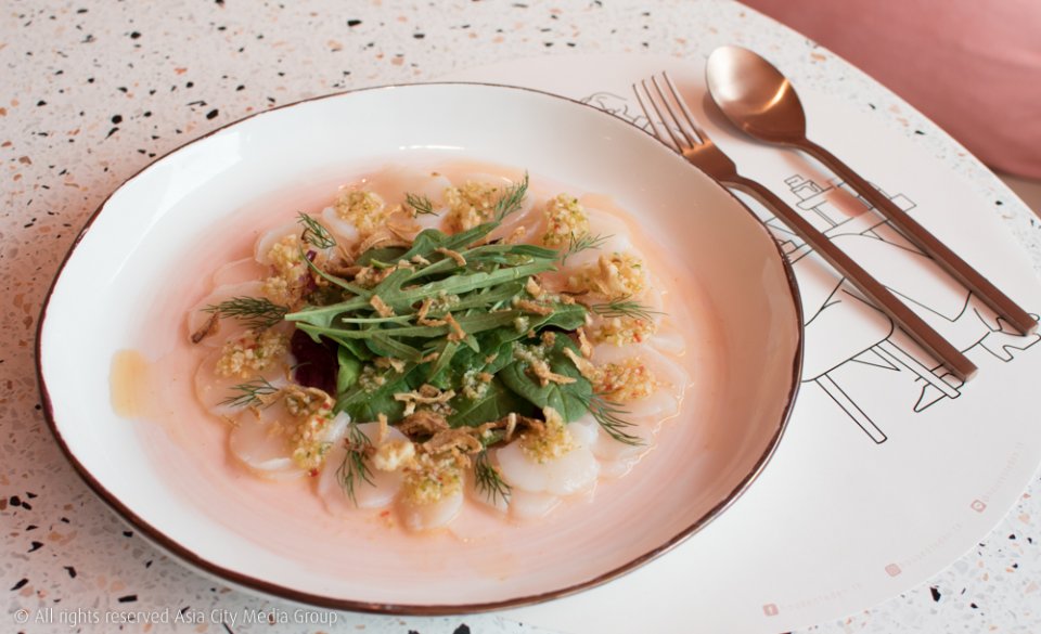 ส่วนอีกสองจานที่เราอยากแนะนำให้ทุกคนมาลองสุด ๆ คือ Scallops Carpaccio (340 บาท) คาร์ปาชิโอหอยเชลล์ตัวใหญ่เนื้อแน่น ๆ ราดน้ำยำรสแซ่บสไตล์คนไทยพร้อมไวด์ร็อกเก็ตและหอมเจียวทอดกรอบมาแบบพอดีพอดี กับอีกจานคือ Crab Omlette (390 บาท) ที่อาจจะไม่ได้รสชาติถึงขั้นเชฟมิชลินสตาร์มาเอง แต่บอกเลยว่าจานนี้อิ่มคุ้มแน่นอน