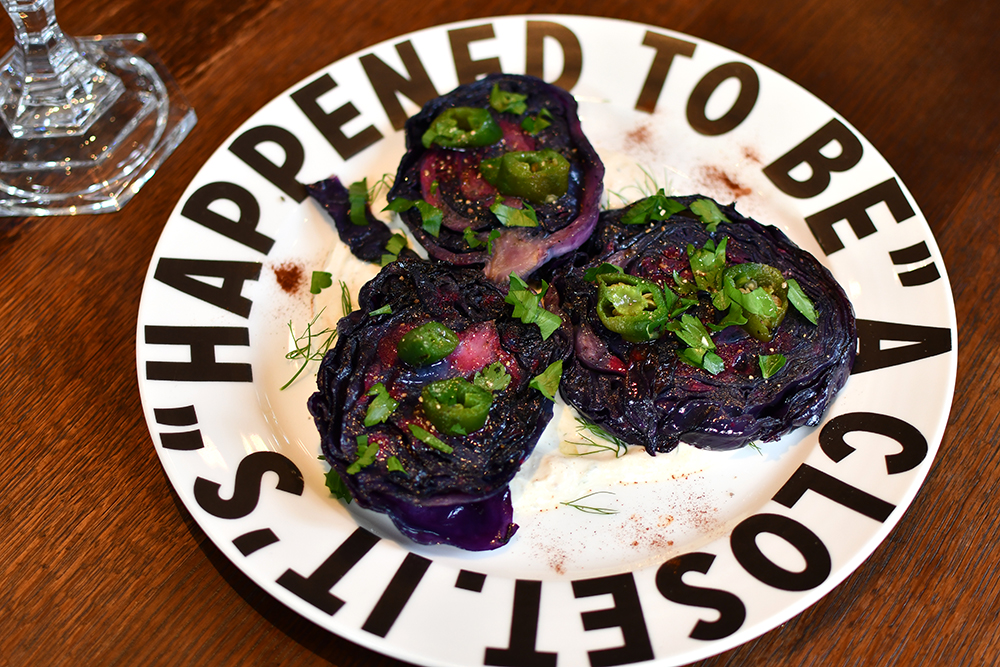 ตัดภาพกลับมาที่เมนูอาหารอิตาเลียนตามแบบฉบับ It's "Happened To Be" A Closet ซึ่งหลังจากการรีโนเวตอาณาจักรรอบนี้ ก็กลับมาพร้อมเมนูสุดอลังการใหม่ ๆ ยาวเป็นหางว่าว รอบนี้เราเลือกสั่ง Dr.Salad No.4 (590 บาท) สลัดจานยักษ์ที่คิดค้นขึ้นมาจากคำสั่งหมอที่ให้กินผักทุกวัน! โดย Dr.Salad นัมเบอร์ต่าง ๆ ล้วนประกอบด้วยผักสดที่นำไปย่างจนกรอบนิ่มและซอสสลัดหลากรสที่ขนาดคนกินผักยากยังกินหมดจาน โดยจานของเราเป็นกะหล่ำปลีม่วงย่างกับซอสทาฮินีสไตล์กรีกรสติดเปรี้ยวและครีมมี่