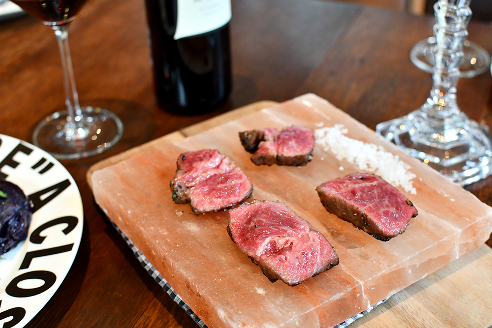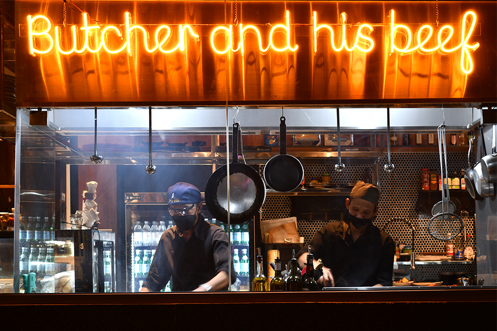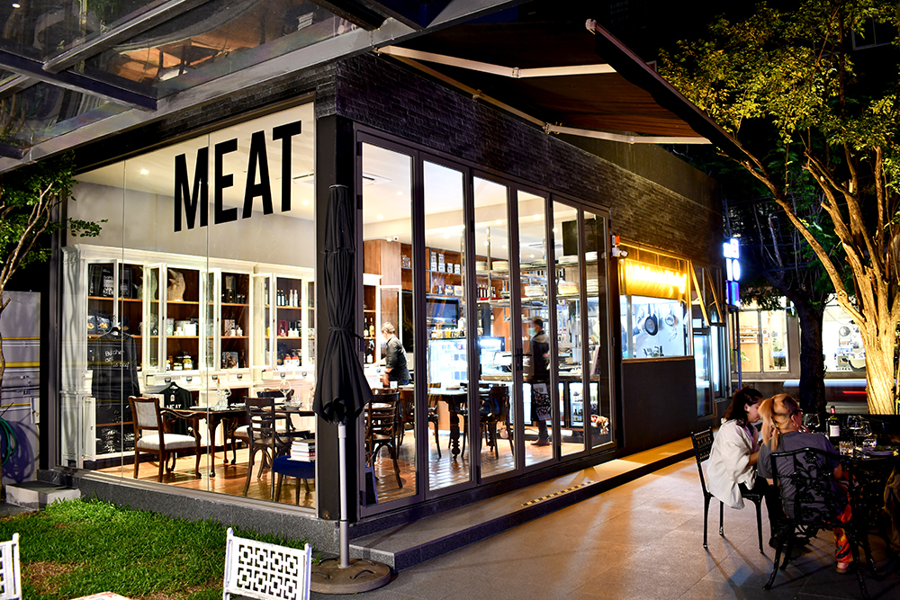ที่ต้องร้องกรี๊ดออกมาดัง ๆ คือห้องกระจกด้านหน้าบ้านที่ต่อเติมขึ้นมาใหม่ โดยอุทิศพื้นที่สนามสีเขียวครึ่งหนึ่งของจากอาณาจักรเดิม ก่อสร้างเพิ่มเติมให้กลายเป็นโซน 'MEAT' โซนที่แค่เห็นชื่อก็รู้เลยว่าเน้นขายเนื้อ โดยจะโฟกัสไปที่เนื้อนำเข้าจากหลากหลายฟาร์มทั่วโลก เน้นเฉพาะฟาร์มที่ไม่ได้อร่อยแค่รสชาติ แต่สตอรี่เบื้องหลังก็ต้องจ๊าบด้วย อาทิ Magaret River Wagyu ฟาร์มวัววากิวชื่อแสนเก๋จากออสเตรเลียที่โด่งดังเรื่องการเลี้ยงวัวแบบ Stress-free ให้น้องวิ่งโลดแล่นบนทุ่งหญ้าเพื่อความสวยงามเนื้อวากิวลายหินอ่อน ซึ่งเนื้อชั้นดีจากหลากหลายฟาร์มที่คัดมาแล้วนี้ จะถูกทางร้านแบ่งมาดรายเอจในตู้แช่ราคาแพงที่ตั้งโชว์เด่นหราอยู่หน้าร้าน