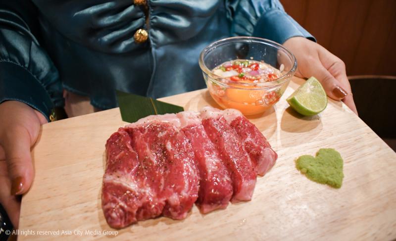ต่อด้วยเมนูปิ้งย่างไฮไลท์ของที่นี่ เริ่มจาก Yaki Suki (399 บาท) ที่เชฟร้านนี้เขาแอบกระซิบมาว่าเมนูนี้บูมมาก ๆ ที่ญี่ปุ่น เพราะเป็นการเสิร์ฟเนื้อ A5 มาแบบจัดหนัก ย่างบนไฟร้อน ๆ เป็นเวลา 30 วินาทีแล้วจิ้มไข่ดองตามเข้าไปเพื่อเพิ่มรสชาติและเท็กซ์เจอร์ให้กลมกล่อมขึ้นไปอีก