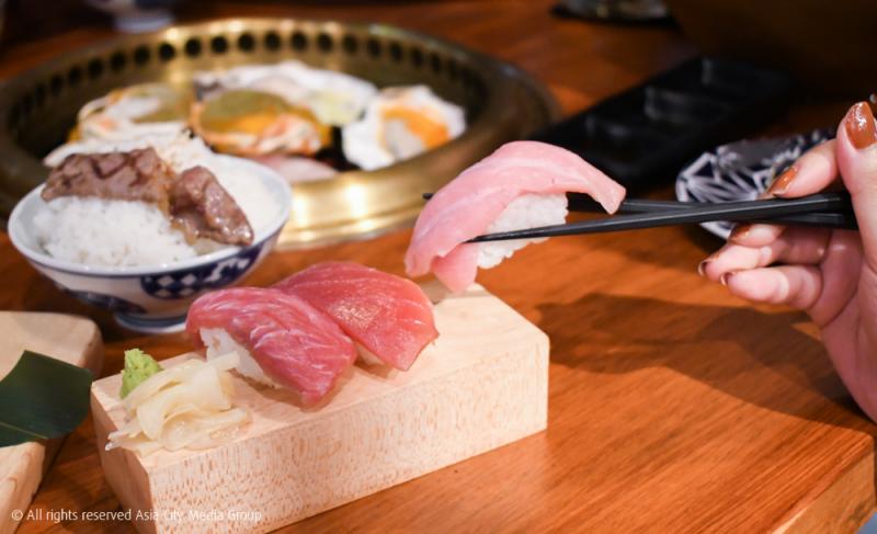 ปิดท้ายด้วยซูชิกันสักสองสามคำก่อนกลับบ้าน เพราะไหน ๆ ชื่อร้านเขาก็เคลมว่าเป็น BBQ&Sushi ทั้งที จะไม่ให้สั่งซูชิมาลองได้ยังไงกัน เราเลยขอสั่งอะไรที่จัดเต็มมาเลยทีเดียวให้มันจบ ๆ ไป ซึ่งนั่นก็คือ Maguro 3 Kinds (350 บาท) ปลามากุโร่เกรดดีที่เสิร์ฟเป็นนิกิริ ประกอบด้วยเนื้อปลามากุโร่ 3 ส่วน ใครที่เป็นสายปลาดิบจะต้องเลิฟมากแน่นอน ซึ่งจุด ๆ นี้ใครจะชวนเพื่อนชนแก้วต่อด้วยโปรโมชั่นเครื่องดื่มจัดเต็มของร้านนี้ก็เลยไม่ว่ากัน มีให้เลือกตั้งแต่โลคัลเบียร์ยี่ห้อต่าง ๆ ไปจนถึงสาเก เหล้าบ๊วย และแก้วโปรดที่เราชอบมากอย่าง Marugoto Kajitsu Shibori (200 บาท) น้ำส้มญี่ปุ่นคั้นสด ๆ ผสมด้วยโซดา สามารถเพิ่มแอลกอฮอล์ลงไปได้ด้วยนะ