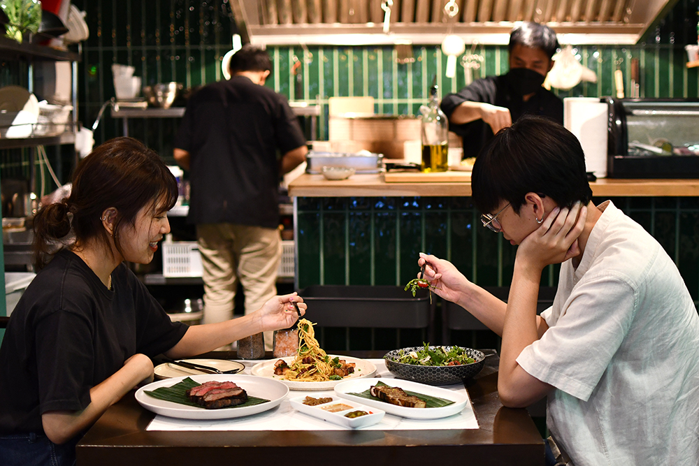 ไม่ใช่แค่เรื่องเปลี่ยนชื่อร้านและคอนเซปต์ใหม่ทั้งหมดเท่านั้นนะ แต่เรื่องดีไซน์ร้านก็เปลี่ยนไปด้วยเช่นกัน จากก่อนหน้านี้ที่เคยเป็นร้านเบอร์เกอร์โอเพ่นแอร์แบบแมน ๆ เตะบอลในฝั่งซ.พหลโยธิน 8 (แมน ๆ เตะบอลของจริง เพราะมีสนามบอลอยู่หลังร้าน!) พอครั้งนี้เขาย้ายโลเคชันมาปักหมุดมาอยู่บนชั้น 2 ของบ้านหลังเก่าริมถนนวิภาวดีในโซนอินทามระ ที่ไม่ไกลจากร้านเดิมมากนัก เขาเลยเปลี่ยนบรรยากาศให้ร้านให้ดูเป็นโตและเป็นทางการมากขึ้นอีกนิด ด้วยโซนห้องอินดอร์ที่ใช้สีเขียวน้ำทะเลเป็นหลัก มีครัวแบบโอเพ่นที่สามารถมองเห็นเชฟเจมส์ย่างเนื้อได้โดยตรง และมีส่วนเอาต์ดอร์ด้านนอกที่ใช้พื้นที่ระเบียงบ้านวางโต๊ะไม้และเก้าอี้ไว้แบบหลวม ๆ ให้ฟีลเหมือนนั่งอยู่บ้านเพื่อนที่ต่างจังหวัด