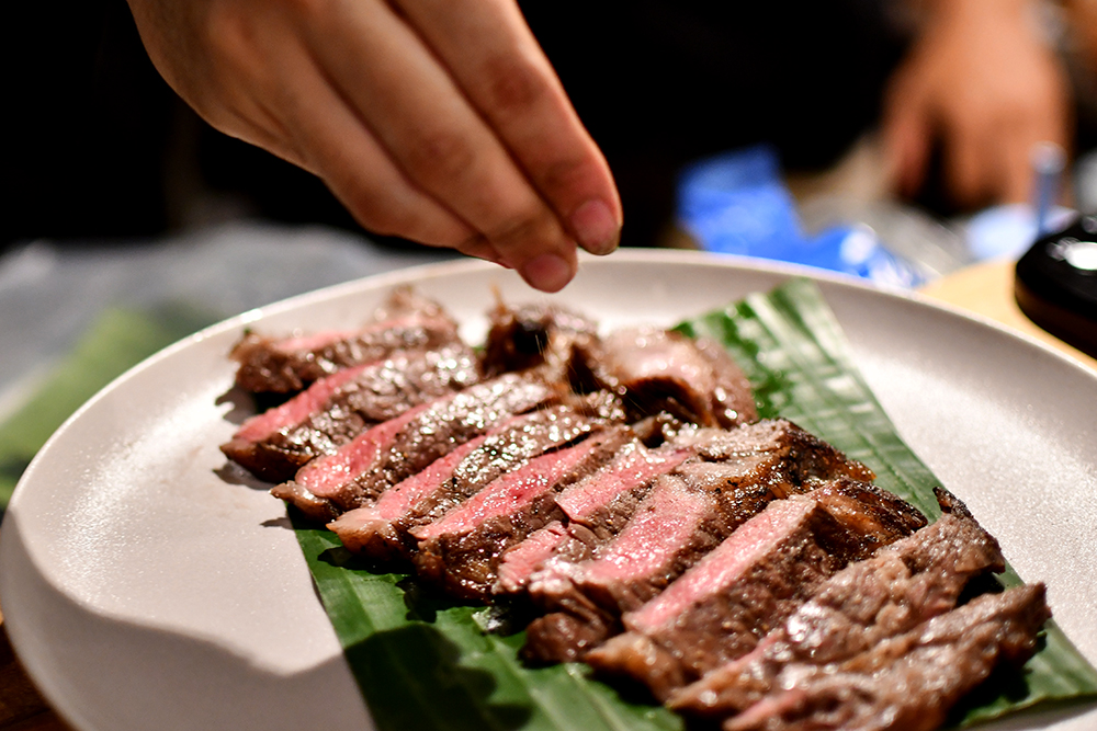 เนื้อวัวสายพันธุ์ไทยวากิวจากฟาร์มในภาคอีสาน ถูกเลือกมาขายในร้านนี้เฉพาะส่วนฮิต ๆ ที่ถือเป็นซิกเนเจอร์ของเชฟเจมส์ที่กริลล์ออกมาเพอร์เฟกต์เสมอ ไม่ว่าจะเป็น Rib-eye (1,600 - 3,000 บาท) Tenderlion (800 - 1,500 บาท) Flat Iron (800 - 1,000 บาท) และ Ox Tongue (189 บาท) ซึ่งส่วนที่เราชอบมาก ๆ คือ Flat Iron ที่ถึงแม้จะเป็นเนื้อส่วน Secondary Part แต่เชฟกริลล์ออกมาได้นุ่มจนถ้าไม่บอกก็นึกว่าเป็นไพรม์คัตเลยทีเดียว กับอีกจานคือลิ้นวัวที่เสิร์ฟมาพร้อมวาซาบิดอง