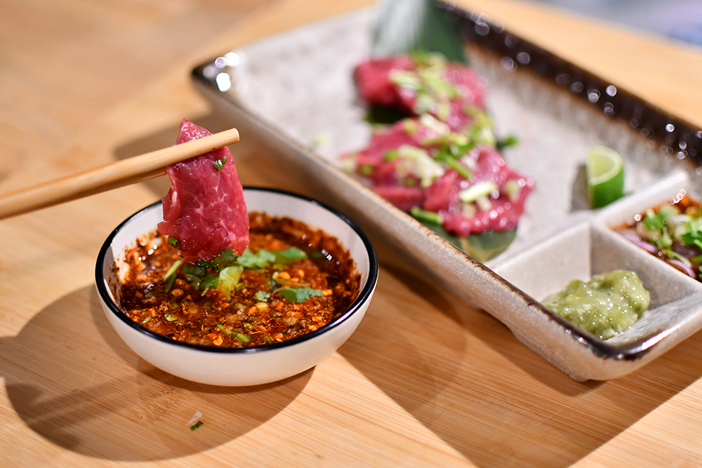 นอกจากนั้นยังมีเมนูพิเศษที่เราเชื่อว่าจะทำให้สายเนื้อใจเต้นแรงทุกครั้งที่มา (เพราะลุ้นว่าจะหมดมั้ยนะ?) นั่นคือ ซอยจุ๊ (129 บาท) เนื้อสะโพกวัวแบบดิบคุณภาพระดับพรีเมียม สไลด์มาชิ้นบาง ๆ ให้จิ้มกับแจ่วขมและวาซาบิดอง ถ้าถามว่ากินซอยจุ๊ร้านไหนแล้วมั่นใจในความปลอดภัยสุด ก็คงต้องยกให้ร้านนี้!