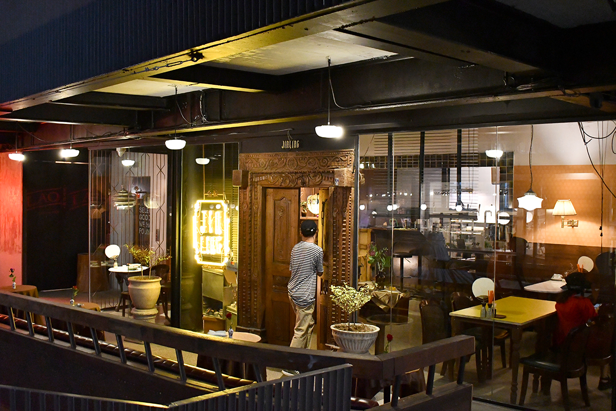 ถ้าให้ยืนดูจากแค่ด้านนอกร้าน Jinling BKK (อ่านว่า จิน-หลิง) มีความลึกลับตั้งแต่การใช้โทนสีดำ-น้ำตาลเข้ม มีแค่แสงไฟสลัว ๆ ที่ออกมาจากโคมไฟพอให้มองเห็นการเคลื่อนไหวภายในร้านได้นิดหน่อย ใครที่ไม่รู้มาก่อนอาจเดาไม่ออกเลยทีเดียวว่านี่คือคาเฟ่กึ่งบาร์สไตล์จีนที่อัดแน่นด้วยหลากหลายเมนูตั้งแต่ อาหารคาว ขนมปัง แท็ปเบียร์ ยันชาเย็น!
