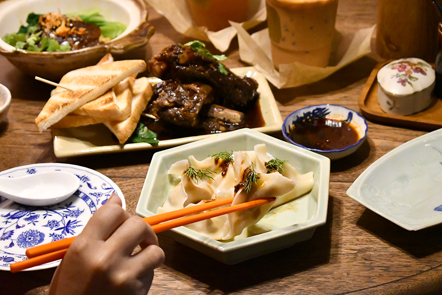 ตัดกลับมาที่เมนูหนักท้องที่มีรอให้สั่งมาวางเรียงบนโต๊ะหินอ่อนทรงกลมของที่ร้านจนแน่นเอี้ยดกันบ้าง เริ่มจาก บะหมี่เป๊าะเนื้อแก้มวัวตุ๋น (260 บาท) เส้นบะหมี่ที่เกิดจากการตัดแป้งเกี๊ยวออกเป็นเส้นบาง ๆ แล้วโปะหน้าด้วยเนื้อแก้มวัวตุ๋นรสกลมกล่อม ส่วนถ้าใครอยากชิมเมนูลูกครึ่งฮ่องกงที่มีความไทยปนอยู่นิด ๆ ก็สามารถพุ่งตัวไปสั่ง เกี๊ยวดาวกุ้ง (160 บาท) มาจับคู่แท็ปเบียร์กันได้ เพราะเกี๊ยวจานนี้เป็นการผสมผสานระหว่างสูตรเกี๊ยวจีน เข้ากับเครื่องเทศไทยอย่างกระเทียมและพริกไทย รับรองว่าจุด ๆ นี้คือสั่งเบิ้ลได้หลายจานจนยั้งตัวไม่อยู่กันเลยทีเดียว