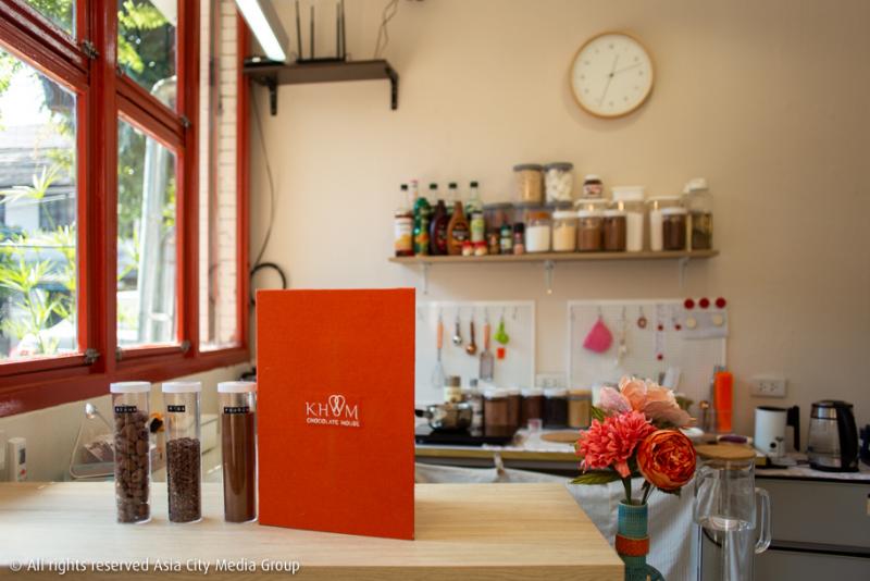 Khom Chocolate House (อ่านว่า ขม) คาเฟ่ช็อคโกแลตขนาดน่ารักที่ตั้งอยู่ในซ. สิงหราช 3 เมื่อเราแวะเข้าไปถึงก็ต้องสะดุดกับตัวร้านที่ดูเรียบ ๆ แต่เตะตาพอตัวในซอยนี้ ด้วยตัวคาเฟ่สีขาวเกลี้ยง ตัดกับสีส้มอิฐของกรอบประตูและหน้าต่าง ก็อดไม่ได้ที่จะผลักประตูเข้าไปคุยกับเจ้าของร้านหนึ่งเดียวที่กำลังง่วนอยู่หลังเคาน์เตอร์อย่างคุณเจน-พิมพ์ชนก ดวงศรี ถึงที่มาที่ไปของร้านนี้ที่เพิ่งเปิดได้สด ๆ ร้อน ๆ และเราเองก็เป็นสื่อแรกที่มีโอกาสได้แวะเวียนมาหาเธอ