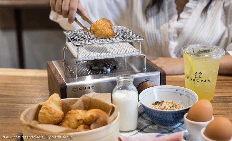 อีกหนึ่งเซ็ตที่ถ้ามาถึงร้านนี้แล้วไม่สั่ง ก็อาจจะไม่ได้รูปสวย ๆ กลับบ้าน เพราะนี่คือหนึ่งใน Best Seller หน้าตาญี่ปุ๊นญี่ปุ่นของร้านนี้ กับ Kokopan Set (285 บาท) เซ็ตอาหารเช้าที่มีไฮไลท์เป็นเจ้า Mini Croissant ครัวซองต์โฮมเมดของร้านที่ทำจากเนยฝรั่งเศส มาในสไตล์เหนียวนุ่มหอมกลิ่นเนย ที่แอบมีกิมมิคน่ารัก ๆ ด้วยการเสิร์ฟเตาปิ้งไซซ์มินิไว้ให้อุ่นครัวซองต์ร้อน ๆ ก่อนจะทานคู่กับไข่ต้ม (แอบหักคะแนนนิดหน่อยตรงที่เป็นไข่ต้ม ถ้าเป็นไข่ลวกจะฟินมากกว่านี้) ไส้กรอกอาราบิกิ แฮม แยมสตรอเบอร์รี่ทำเอง และนมกับคอร์นเฟลคที่สามารถเปลี่ยนเป็นกราโนล่าด้วยก็ได้