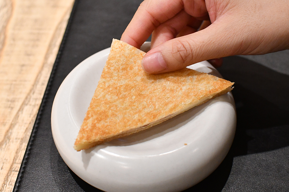 จานเรียกน้ำย่อย 3 คอร์สแรก เริ่มจากสลัดผักโขม Baby Spinach Blue Cheese Salad ที่แอบเซอร์ไพรส์เราด้วยรสชาติไม่คุ้นปากของมะละกอไทยและบลูชีส เพื่อเปิดต่อมรับรส ถัดมาคือ Iberico Sandwich Toast แซนด์วิชหน้าตาพื้น ๆ แต่รสชาติถูกใจเด็กอ้วนอย่างเราด้วยการสอดไส้ด้วยแฮม Iberico จากสเปน ซึ่งเป็นแฮมที่ใช้ส่วนพุงหมูมาทำ โดยเชฟบอกว่านี่เป็นเมนูเรียกน้ำย่อยที่ลูกค้าทุกคนเลิฟมาก ๆ และถึงแม้คอร์สนี้จะเปลี่ยนเมนูไปบ้างในแต่ละซีซันเพื่อให้เข้ากับฤดูกาลของวัตถุดิบ แต่เมนูแซนด์วิชนี้จะต้องอยู่เอาใจลูกค้าเสมอในทุกครั้ง