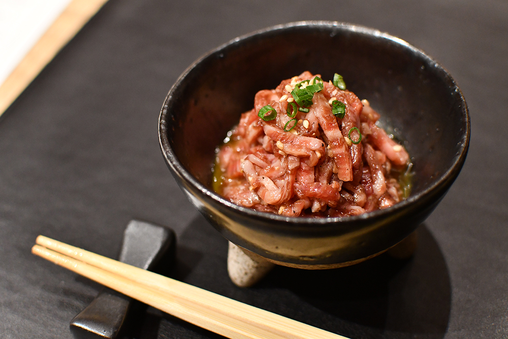 ปิดท้ายการเรียกน้ำย่อยด้วย Rib-Eye Wagyu Yukke เนื้อวากิวดิบที่เสิร์ฟมาในสไตล์ยุเกะแบบญี่ปุ่น พร้อมไข่นกกระทาให้คลุกเคล้าจนเข้ากันเพื่อความชุ่มฉ่ำ ส่วนใครที่ไม่ไหวจะเคลียร์กับเนื้อดิบ ก็สามารถส่งให้เชฟเอาไปเบิร์นไฟด้านบนได้นะ