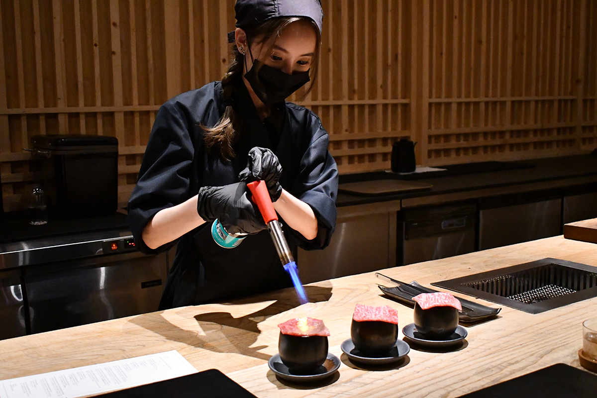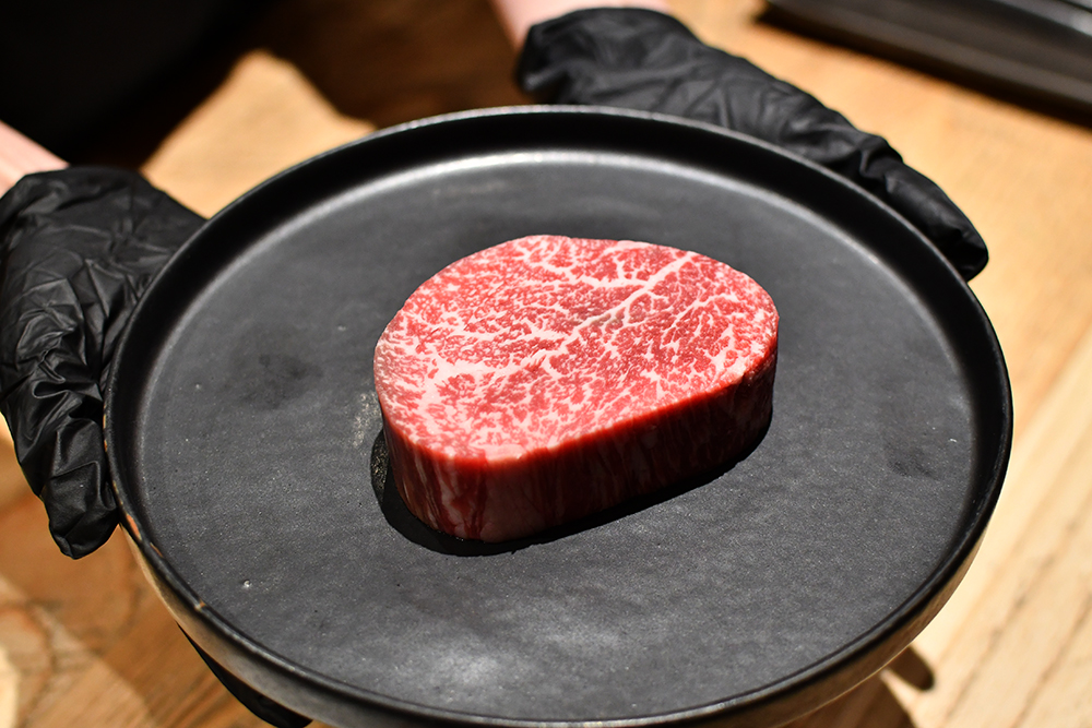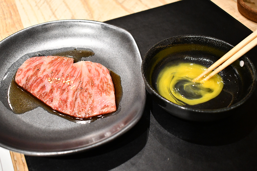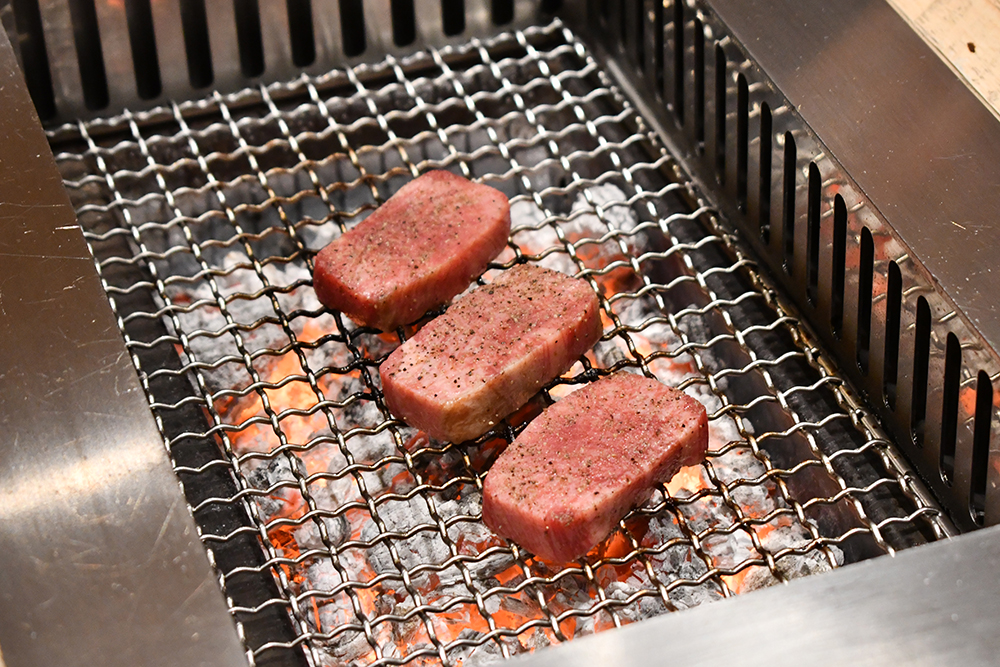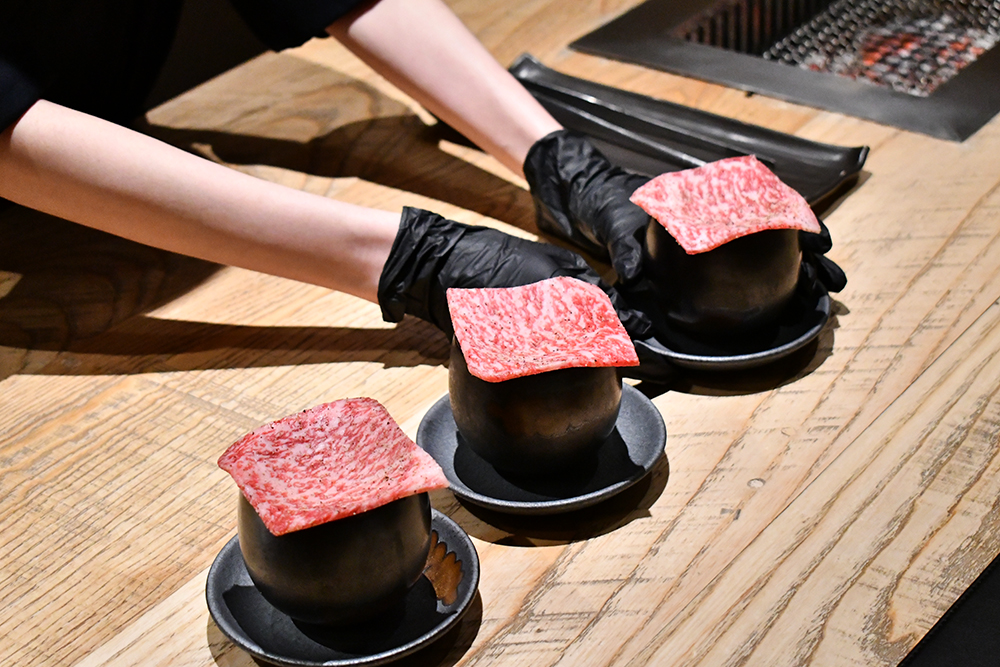 มาต่อกันฝั่งเมนคอร์สที่แน่นอนว่าเป็นเนื้อล้วน ๆ เน้น ๆ ยาวไปอีก 9 คำ ซึ่งไฮไลต์ที่ทำให้เราต้องดั้นด้นมากินโอมากาเสะเนื้อที่นี่ ไม่ใช่แค่ทุกเมนคอร์สทำด้วยสไตล์ยากินิคุหรือปิ้งย่างบนเตาถ่านเท่านั้น แต่ไฮไลต์จริง ๆ คือเนื้อวัวที่ทางร้านเลือกใช้แค่เนื้อวัวจากฟาร์มฟุราโนะ (Furano) จังหวัดฮอกไกโด ประเทศญี่ปุ่นเท่านั้น โดยสาเหตุที่เลือกใช้เนื้อวัวจากที่นี่คือคาแรกเตอร์หลักของตัวเนื้อวัวที่ลีนไขมันมาพอเหมาะ ทำให้ไม่ติดมันจนเลี่ยนเกินไปสำหรับการปิ้งย่าง ซึ่งทางร้านเล่าให้เราฟังว่าวัวที่ฟาร์มนี้จะกินเฉพาะกากเต้าหู้และกากเบียร์เท่านั้น