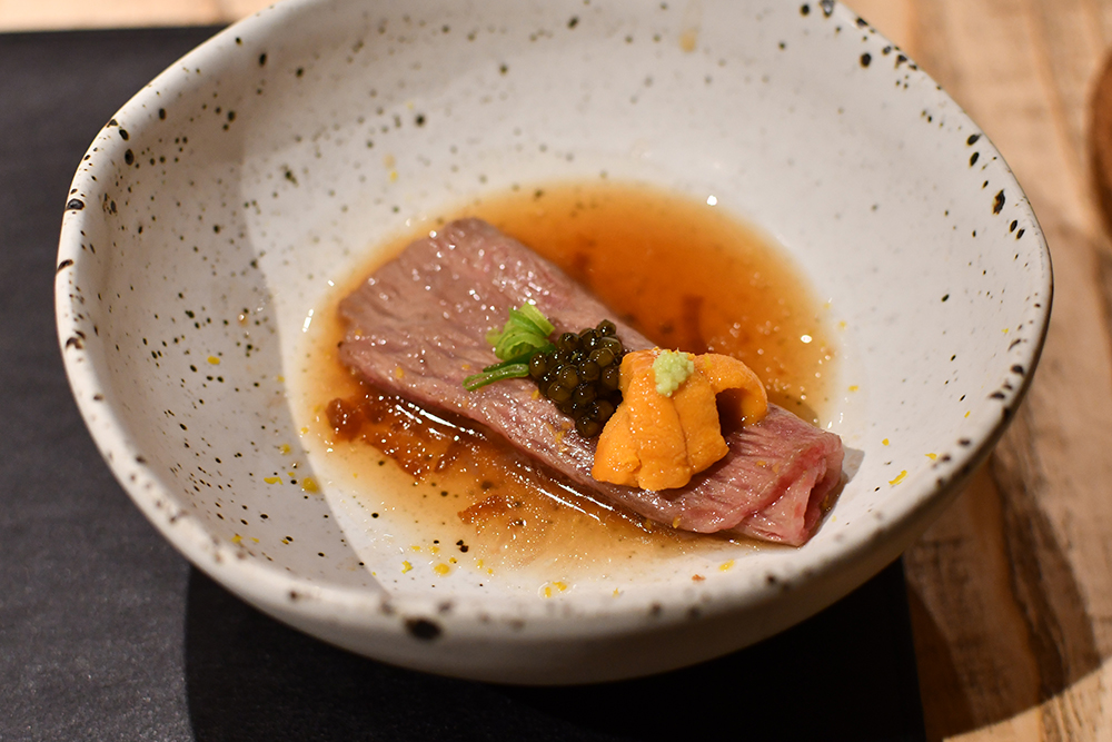 พาร์ตต่าง ๆ ของเจ้าวัวฟุราโนะเลยถูกคัดสรรมาเป็นอย่างดีเพื่อเสิร์ฟเป็นดาวเด่นของในแต่ละเมนคอร์ส คำที่เราชอบเป็นพิเศษขอยกให้กับคำที่ 6 ที่ทางร้านเลือกใช้เนื้อวากิวฟุราโนะส่วนสันคอมาย่างจนได้ความ Medium Rare ที่พอดิบพอดี ท็อปด้านบนด้วยไข่หอยเม่นและคาเวียร์ ทานคู่กับซอสเรดไวน์ที่ตัดบาลานซ์ด้วยกลิ่นอายแบบญี่ปุ่นของซอสพอนสึ