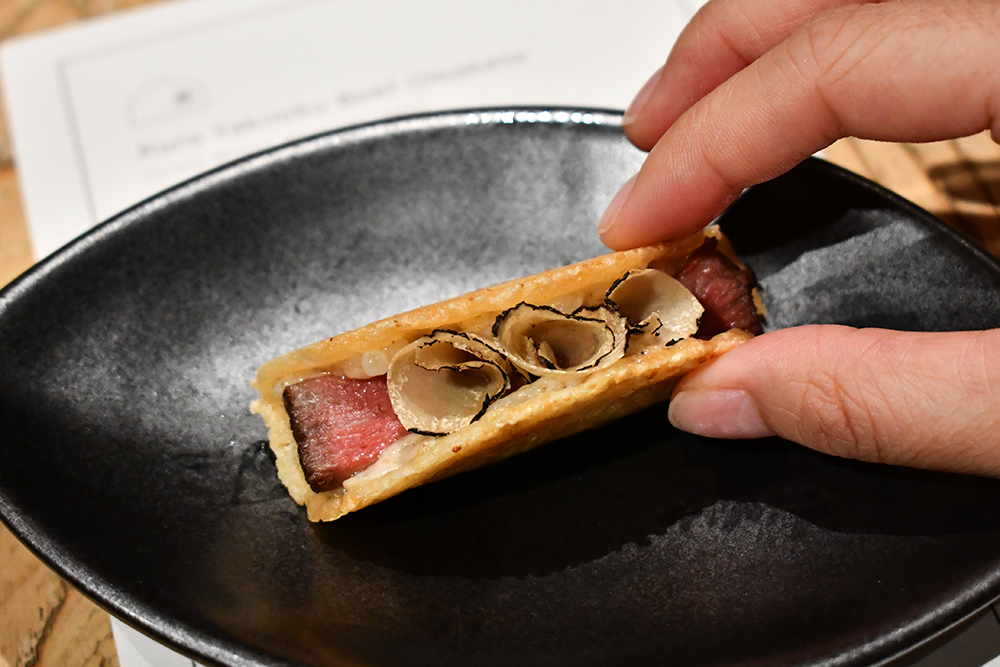 แม้ว่าถึงตอนนี้ทุกคนจะเริ่มอิ่มจุกกันแล้ว แต่เราไม่อยากให้พลาดความฟินขึ้นสวรรค์ของ 2คอร์สสุดท้าย ที่เสิร์ฟเนื้อสตริปลอยน์หมักซอสสุกี้ยากี้มาให้จิ้มทานคู่กับไข่ดิบสไตล์ญี่ปุ่นแท้ ๆ และคำสุดท้ายที่รสชาติติดตาตรึงใจเรามาจนถึงทุกวันนี้ กับการนำพาร์เมซานชีสไปทอดจนกลายเป็นแผ่นแป้งทรงทาโก้ ใส่ไส้ด้านในด้วยรีซอตโต้เท็กซเจอร์ครีมมี่ ที่เข้ากันดีกับสเต็กเนื้อเทนเดอร์ลอยน์ชิ้นพอดีคำและเห็ดทรัฟเฟิลดำสไลซ์บาง