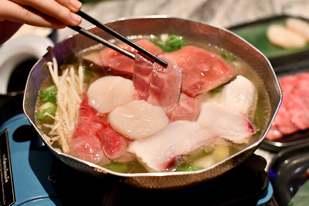 และไหน ๆ ก็มาถึง Kuro House ทั้งที เราเลยขอพาแวะไปชิมเซตชาบูที่อีกฝั่งกันสักหน่อย เพราะได้ข่าวมาว่าใครที่เป็นสายรักเนื้อต้มก็ไม่ควรพลาดโซนชาบูของที่นี่ด้วยประการทั้งปวงเช่นกัน ทีเด็ดของชาบูที่นี่คือเบสน้ำซุปที่เคี่ยวมาจากปู สามารถสั่งได้ทั้งเซตเนื้อ หมู หรือแม้แต่ปลาที่ใช้เกรดเดียวกับปลาดิบในโซนซูชิ ทานเสร็จอย่าลืมตอกไข่ออร์แกนิกลงไปในหม้อพร้อมข้าว เพื่อปิดจ็อบรอบสุดท้ายเป็นข้าวต้มซุปปูให้อิ่มท้องก่อนกลับบ้าน