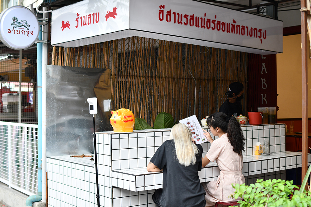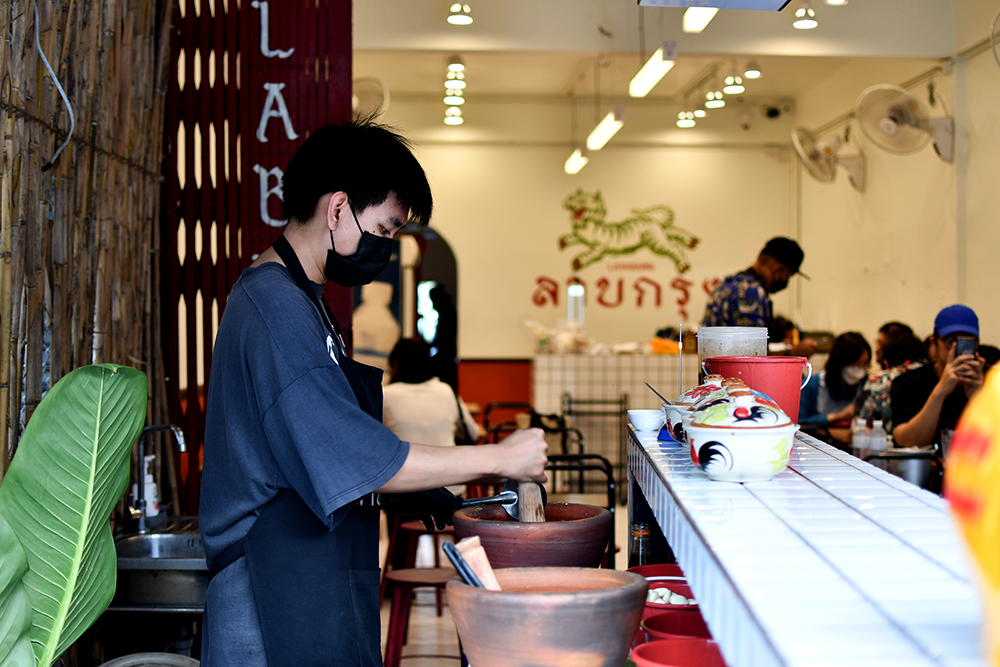 พื้นที่ห้องแถวขนาด 1 คูหา ในย่านวังหิน ถูกจับมาตกแต่งให้ดูฮิปเกินกว่าร้านลาบทั่วไปด้วยดีเทลง่าย ๆ อย่างกระเบื้องสีขาว ผนังไม้ไผ่ ลายเพนต์รูปเสือที่เป็นไอคอนิกของร้าน พร้อมก่อเคาน์เตอร์บาร์ส้มตำขึ้นมาที่ด้านหน้า และวางโต๊ะไม้กับเก้าอี้เหล็กง่าย ๆ สไตล์ไทยบ้านลงไป มองเผิน ๆ อาจนึกไม่ออกด้วยซ้ำว่านี่มันร้านลาบจริงรึเปล่า!