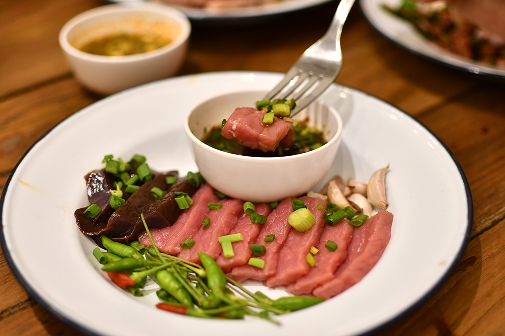 ปิดท้ายด้วยเมนูฮอตฮิตที่ไม่น่าเชื่อว่าวัยรุ่นทุกโต๊ะจะสั่งมากินกันหน้าตาเฉย นั่นคือ ซอยจุ๊ (90 บาท) เนื้อดิบซอยเป็นแผ่นคล้ายปลาดิบ เสิร์ฟคู่กับน้ำจิ้มแจ่วขมและแจ่วเปรี้ยวที่บอกเลยว่าสายลึกต้องมาโดน!