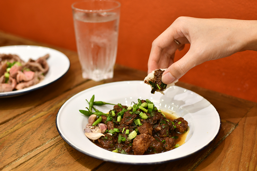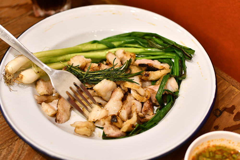 ต่อกันที่อีกหนึ่งเมนูซิกเนเจอร์ที่ต้องลุ้นว่าจะหมดก่อนไปถึงร้านหรือเปล่า เนื่องจากมีจำนวนจำกัดต่อวัน นั่นคือ บักพร้าวดาดไฟ (160 บาท) เมนูเนื้อย่างที่เลือกใช้ส่วน 'บักพร้าว' หรือ 'เนื้อลูกมะพร้าว' ซึ่งเป็นส่วนอกของวัวมาดาดไฟแรงให้พอหอม เสริมกลิ่นสุดจ๊าบด้วยก้านโรสแมรี่ ใครที่ชอบเนื้อย่างเทกเจอร์กรุบ ๆ เคี้ยวสู้ฟัน เราไม่อยากให้พลาดจานนี้ด้วยประการทั้งปวง