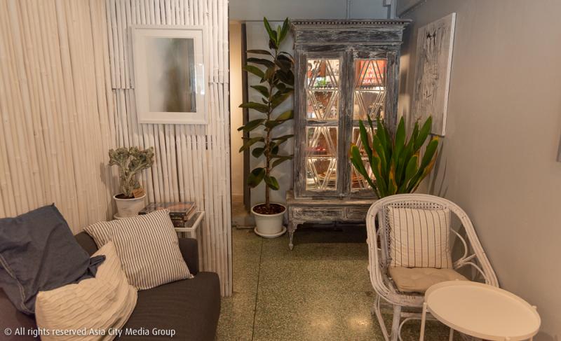ในเช้าที่จอกแจกจอแจ ถนนย่านอนุสาวรีย์ฯ เต็มไปด้วยรถคันเล็กใหญ่คับคั่งเต็มอัตรา เราเปิดประตูกระจกเข้าไปในคาเฟ่ห้องแถวเล็ก ๆ และพบความเงียบสงบที่รู้สึกได้ตั้งแต่ก้าวแรก เสียงเครื่องยนต์ด้านนอกถูกดับด้วยเสียงเพลงคลอเบา ๆ ความร้อนในร่างกายจากการเดินทางถูกแทนที่ด้วยอากาศโปร่ง ๆ และสีเขียวสบายตาจากต้นไม้สไตล์โบทานิคัล อาทิ ยางอินเดีย ไทรใบสัก และมอนสเตอร่าที่ถูกปลูกอย่างหนาแน่นทั่วพื้นที่ร้าน