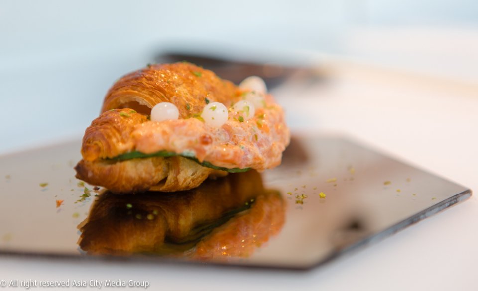 อย่างเช่นเมนูที่มีฐานเป็นแผ่นบิสกิตงาดำ ท็อปข้างบนด้วยชูโทโร่ทาทากิ ซึ่งไม่น่าเชื่อว่ากลิ่นงาดำไม่ได้กลบรสทูน่าเลยแม้แต่น้อย กับอีกจานที่เราชอบมากคือครัวซองต์อันนี้ที่แต่งหน้าด้วยไข่มุก (ที่ตอนแรกไม่แน่ใจว่ามันกินได้จริงรึเปล่า) จริง ๆ คือมันกินได้และอร่อยด้วย แต่เรื่องรสชาติว่าข้างในคืออะไร เราบอกเลยว่านี่คือความลับที่ควรมาลองด้วยตัวเอง