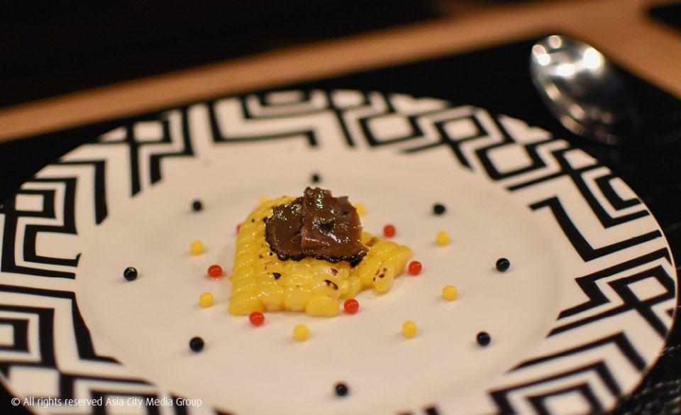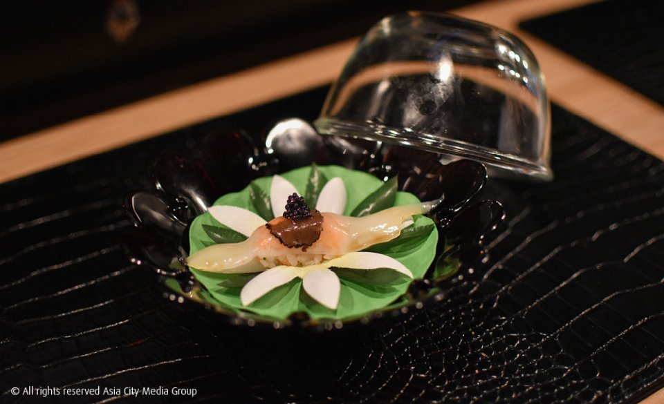 อีกหนึ่งจานจาก 13 เมนูที่เราชอบมากคือ Corn Truffle ที่นำข้าวโพดญี่ปุ่นไปเผากับน้ำมันแบล็คทรัฟเฟิล แต่งหน้าด้วยทรัฟเฟิลชิ้นหนาและไข่มุกหลากสีเม็ดเล็ก กับอีกจานในชื่อ Lotus Ika ที่บอกเลยว่าไม่ได้มีดีแค่หน้าตา แต่วัตถุดิบยังเป็นระดับท็อปทั้งนั้น ไม่ว่าจะเป็นปลาอิกะจากญี่ปุ่น แบล็คทรัฟเฟิล และไข่ปลาคาเวียร์
