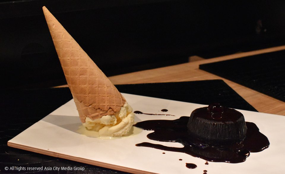 ปิดท้ายด้วยเมนูของหวานหนึ่งเดียวในคอร์สหลังจาก 13 จานหลัก คือเมนูในชื่อ Falling Icecream ที่เอาศิลปะแบบ Abstract Art มาผสมผสานกับเมนูช็อคโกแลตลาวาเข้มข้นและไอศกรีมโฮมเมดวนิลา จุด ๆ นี้บอกเลยว่าความอร่อยจานนี้พีคมากจริง ๆ ไม่โกหก