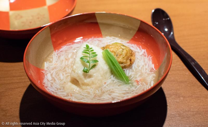 ส่วนใครที่รักทั้งปู รักทั้งเต้าหู้ เราเชื่อว่าจะต้องชอบความละมุนและเข้ากันดีของคอร์สที่ 5 ที่เชฟเลือกใช้เนื้อปูขน Zuwai จากฮอกไกโดมาทำเป็นซุป มีเต้าหู้ปั้นก้อนผสมเนื้อปลาและถั่วแระญี่ปุ่นลอยอยู่ตรงกลาง ความหวานของเนื้อปูช่วยเพิ่มความน่าสนใจให้เมนูนี้ได้อย่างเต็มเปี่ยม แถมตัวลูกชิ้นเต้าหู้ก็ทำรสชาติออกมาได้กลมกล่อมอูมามิถูกปากเราแบบสุด ๆ ไปเลย !