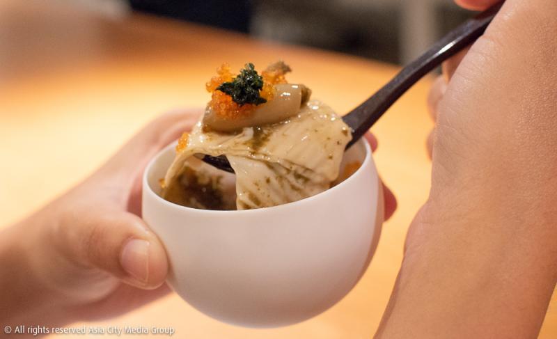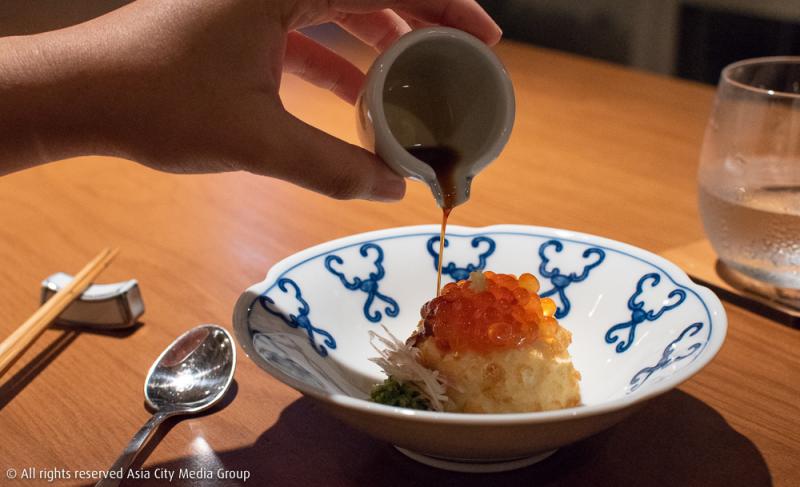ส่วนคอร์สที่เราชอบที่สุดขอยกให้จานที่ 8 และจานที่ 9 เริ่มด้วยเมนู 8 ซึ่งเป็นดงบุริเสิร์ฟมาในถ้วยทรงไข่ถ้วยเล็ก ด้านในเป็นข้าวหน้าหอยเป๋าฮื้อที่มีส่วนผสมของ Yuba Tofu หรือครีมเต้าหู้สดนั่นเอง ส่วนจานที่ 9 นางคือสิ่งที่เรียกว่า Zaru Tofu เป็นเต้าหู้สดแล้วผึ่งให้น้ำไหลออกผ่านตะกร้าสาน ซึ่งเป็นกรรมวิธีโบราณจากโรงงาน Mihara (Zaru แปลว่าตะกร้า) แล้วนำไปคลุกแป้งทอดจนกรอบ ท็อปปิ้งมาด้วยไข่ปลาแซลมอนหรือ Ikura จากฮอกไกโดแบบพูน ๆ