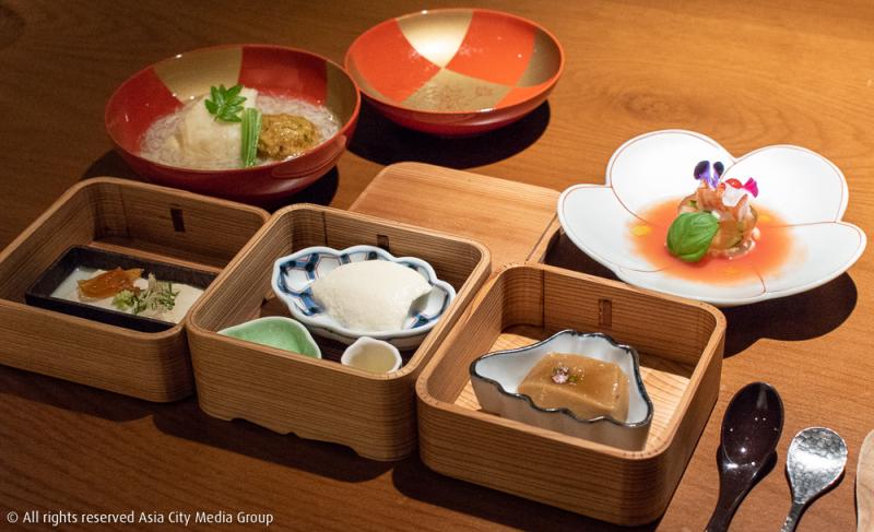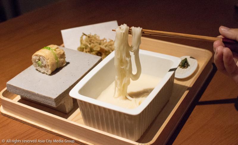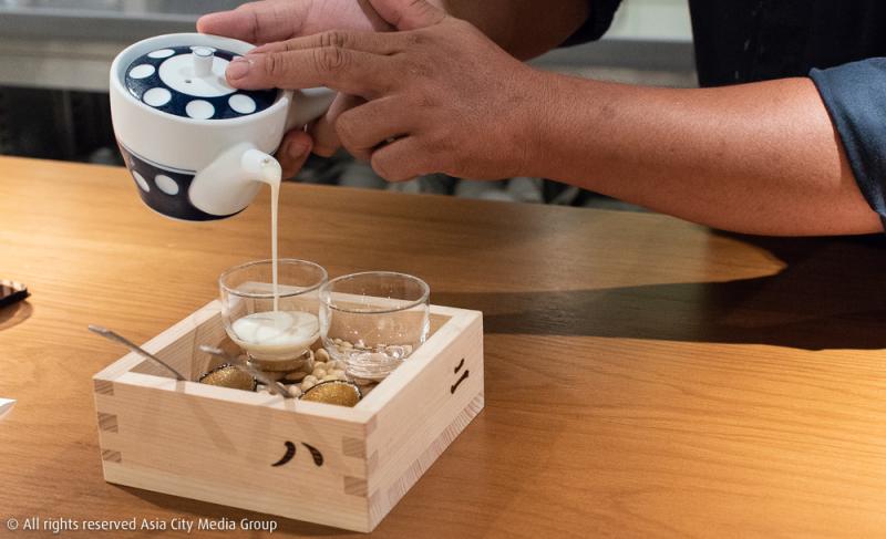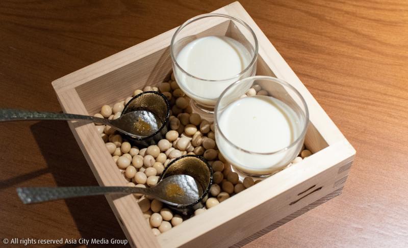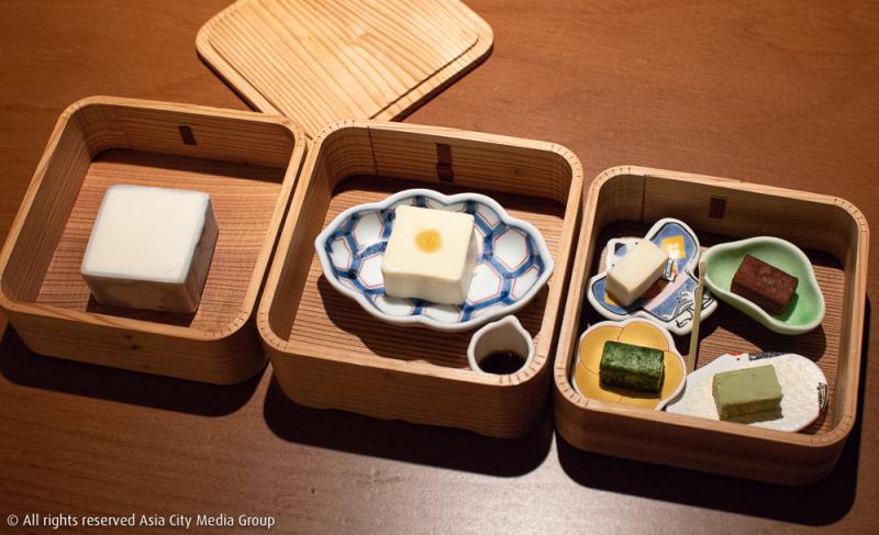 เชฟต้อนรับเราด้วยการรองท้องให้อุ่นก่อนด้วยน้ำเต้าหู้ต้มสด ต่อด้วยปิ่นโตสามแถวมาติด ๆ ที่ประกอบด้วยเมนูเต้าหู้สามสไตล์ คือ Yuki Tofu เต้าหู้สดสูตรลับที่ตระกูลมิฮาร่าไปได้มาจากโอกินาว่า Goma Tofu เต้าหู้เนื้อโมจิรสงาดำ และ Yuba Mille Feuille ฟองเต้าหู้แผ่นบางซ้อน 6 ชั้น โดยมีเยลลี่รสพอนสึรสเค็มเสิร์ฟคู่มาช่วยตัดความจืดที่อาจไม่คุ้นปากคนไทยอย่างเราเท่าไหร่นัก