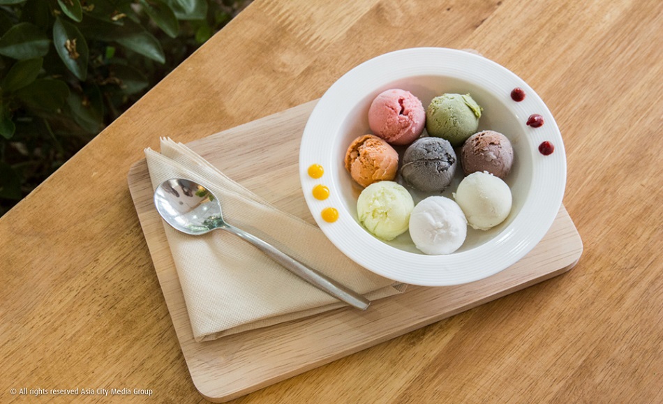 ไอศกรีมมีให้เลือกถึง 13 รส ตั้งแต่มะพร้าว, ทุเรียน, เสาวรส, งาดำ, ช็อกโกบานานา, ช็อกโกอัลมอนด์, สตรอว์เบอร์รีซอร์เบต์, โกโก้, มอคค่า, มะพราวอัลมอนด์, ชาไทย, ชาเขียวและโฮจิฉะ (1 ลูก 45 บาท, 2 ลูก 85 บาทและ 3 ลูก 125 บาท) หรือจะลองสั่งแบบวาฟเฟิลกับผลไม้สดเสิร์ฟพร้อมไอศกรีม (1 ลูก 149 บาท, 2 ลูก 189 บาทและ 3 ลูก 229 บาท) ก็ดี เราชอบโยเกิร์ตพร้อมดื่ม (ขวดละ 25 บาท) รสชาติคล้ายนมเปรี้ยว แอบบอกว่าอานุภาพจุลินทรีย์ของเขาแรงจริงและดีต่อระบบขับถ่ายด้วยนะ