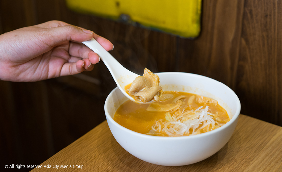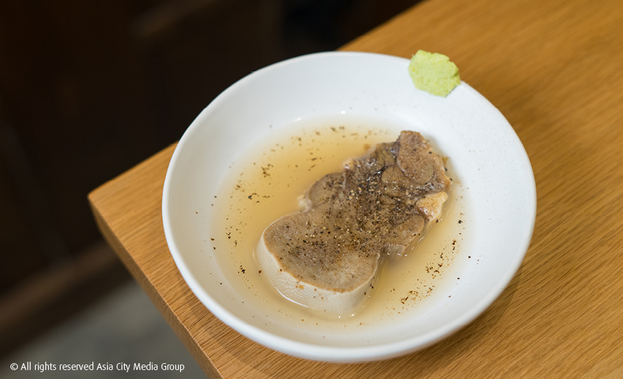 แต่เมนูที่ทำให้เราร้องว้าวจริง ๆ คือ ลิ้นวัวตุ๋น (139 บาท) ในซุปใสที่ตุ๋นมาจนนุ่มละมุนละไม แบบแค่บดชิ้นลิ้นกับเพดานปากก็ละลายแล้ว ถ้าแต้มวาซาบิลงไปสักนิดก็จะได้รสชาติที่แตกต่างไปเลย ส่วนอีกเมนูซุป ๆ ก็คือ ไส้หมูต้ม (129 บาท) กับน้ำซุปข้นกลมกล่อมและเผ็ดนิด ๆ